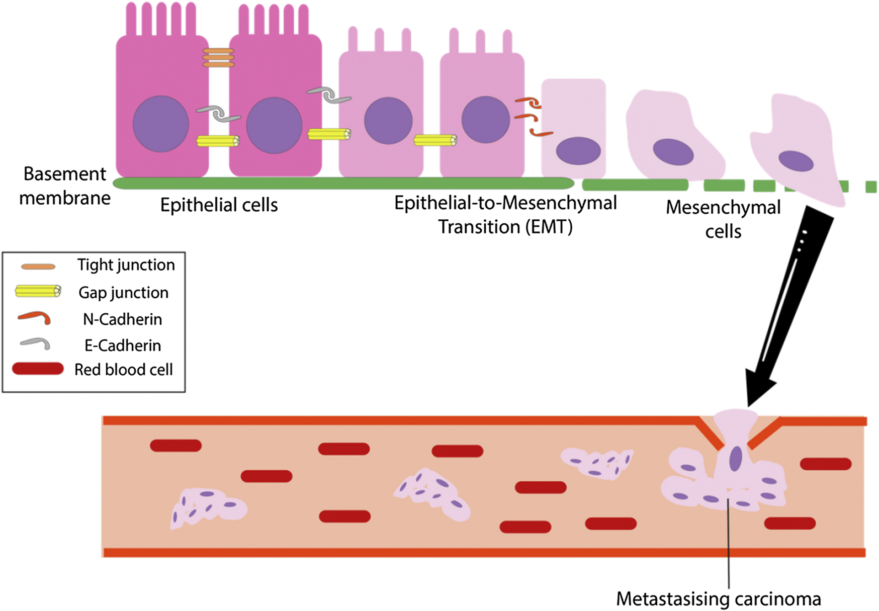 The overall EMT process. The epithelial-mesenchymal transition (EMT) is the process which tumor cells change from epithelioid to mesenchymal cell morphology and is marked by a loss of cell polarity, tight, gap and adherent junctions in epithelial cells, resulting in mesenchymal cells that has increased migratory and invasive capabilities (Li et al., 2019).