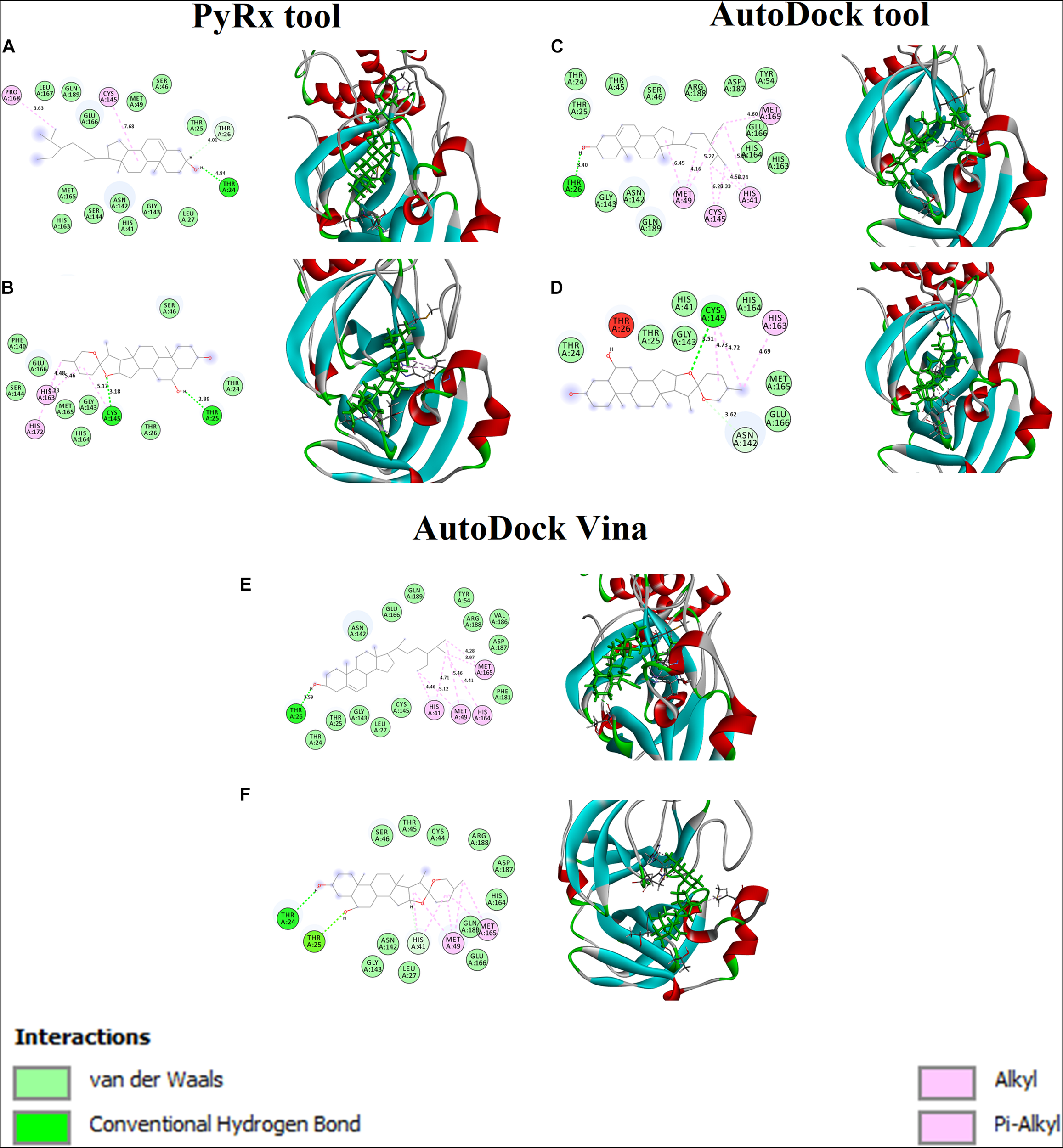 Figure 2. Binding affinity and amino acid interactions of phytocompounds. (A,C,E) Mpro complexed with beta-sitosterol and (B,D,F) Mpro complexed with beta-chlorogenin.