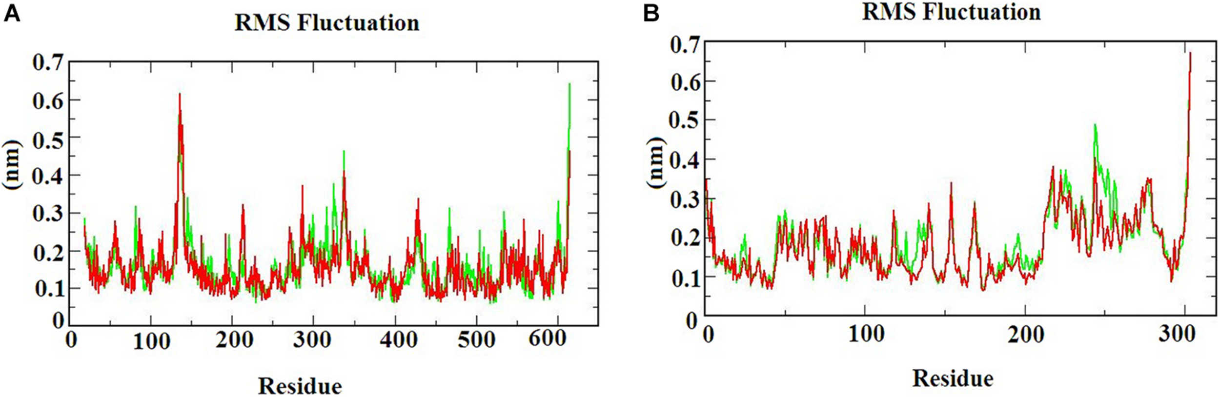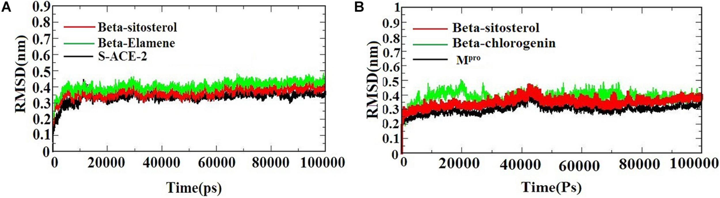 A molecular dynamics simulation was performed to evaluate the stability and conformational changes of the docked complex. Figures 3A,B) represents the MDS of S-ACE2 with the beta-sitosterol and beta-elemene complexes; Mpro with the beta-sitosterol and beta-chlorogenin complexes, respectively. To examine the degree of conformational changes in the protein (backbone) and docked complexes, RMSD was calculated for 100 ns simulation trajectories for each complex. The RMSD of the backbone of S-ACE2 showed stability throughout the simulation (indicated in black) by maintaining a peak of 0.3 nm. S-ACE2 with the beta-sitosterol (indicated in red) and beta-elemene (indicated in green) complexes also occurred in the acceptable range and no major fluctuations were observed when compared to the backbone (Figure 3A). The backbone atoms of Mpro (indicated in black) maintained a peak with equilibration ranges between 0.25 and 0.4 nm and showed better stability until the end of the simulation. On the other hand, the Mpro with beta-sistosterol showed a similar acceptable range from 0.3 to 0.45 nm (indicated in red). The beta-chlorogenin equilibrated at 5 ns, fluctuated < 0.1 nm (on an average), and showed constant peaks throughout the simulation (indicated in green). Hence, all the three converged at 40 ns and were constant at the end of the simulation (Figure 3B). RMSD of the complexes were calculated as a function of time period to evaluate the conformational stability of the phytocompounds (Selvaraj and Singh, 2014). The trajectory analysis revealed that the protein-ligand complexes were stable and active in dynamic movement after attaining the equilibrium state. From the obtained results, it was observed that the taken complexes were stable throughout the simulation.