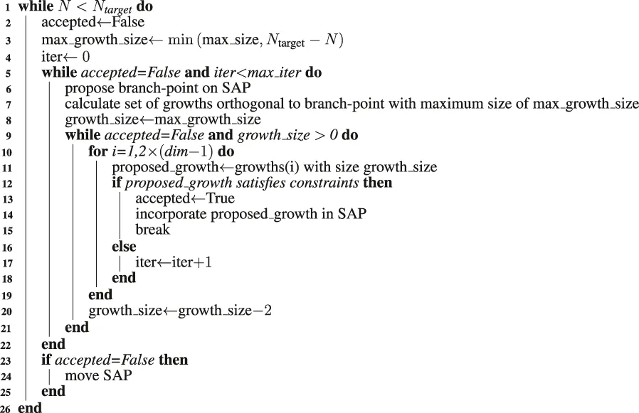 A SAP with a greater number of monomers can be grown from an existing SAP by severing the bond between a pair of consecutive monomers and adding a closed branch orthogonal to the vector between that pair of monomers (Buenemann and Lenz, 2010; Goodsell et al., 2018). This is done in an unbiased fashion by randomly selecting consecutive pairs of monomers to serve as a branch-point and then randomly proposing growths in the orthogonal directions, an example of proposed growths is depicted in Figure 3A. Each proposed growth is only accepted if the resulting SAP satisfies all of the constraints. For example, growth #1 in Figure 3B may have been accepted because all of the other proposed growths violated the ribosome constraints. If a satisfactory growth can not be found, then the SAP is moved before searching for growths again. Pseudocode for the SAP growth algorithm is presented in Algorithm 1.