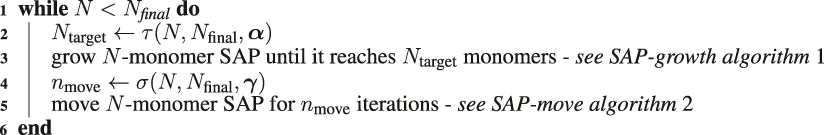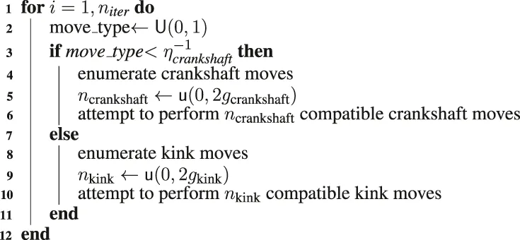 Crankshaft moves are the most computationally expensive to both enumerate and sample; however, they cause the fastest change in the configuration. The naive solution to this problem was to assign a frequency at which crankshaft moves were performed, , and multiplicities for the number of kink and crankshaft moves that were performed after a single enumeration of kink or reflect moves, and , respectively. These parameters describing the sampling were then manually adjusted. Using this methodology prevents ergodic sampling from ever occurring. This can be illustrated by considering the fact that as long as crankshaft moves are sampled in batches of every iterations, then unless only a single crankshaft move is possible, there will never be an instance in which a kink move is sampled immediately after a crankshaft move. The inverse case is also true. An alternative is to randomly select the iterations at which crankshaft moves will be enumerated and performed, where the probability is given by . Once the move type is determined using this criteria, randomly sample the number of moves to be performed from a distribution whose mean is equal to the multiplicity of the respective move type. For example, in the case of discrete uniform distributions and . Now there exists the possibility that any sequence of kink and reflect moves may be sampled. Pseudocode for the SAP movement algorithm is presented in Algorithm 2.