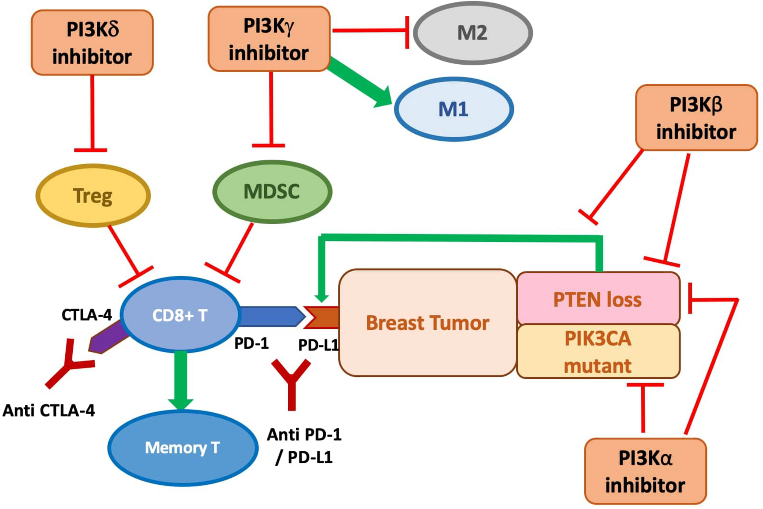 Figure 2. The anti-tumor role of PI3K inhibitors on breast cancer with direct inhibition on cancer cell proliferation and indirect stimulation of the immune response, and potential synergy with immune checkpoint inhibition. PI3Kδ inhibitor is shown to suppress Treg function. PI3Kγ inhibitor may prevent MDSC infiltration and accumulation and polarize macrophages to the M1 phenotypes. PI3Kβ inhibition antagonizes the p110β activity required for PTEN-null tumor and targets the increased PD-L1 expression on PTEN-null tumor. PI3Kα inhibition is demonstrated to be effective at preventing tumor cell growth, especially in PIK3CA mutants, but might also be promising in PTEN-null tumor to prevent the PI3Kβ/α feedback loop.