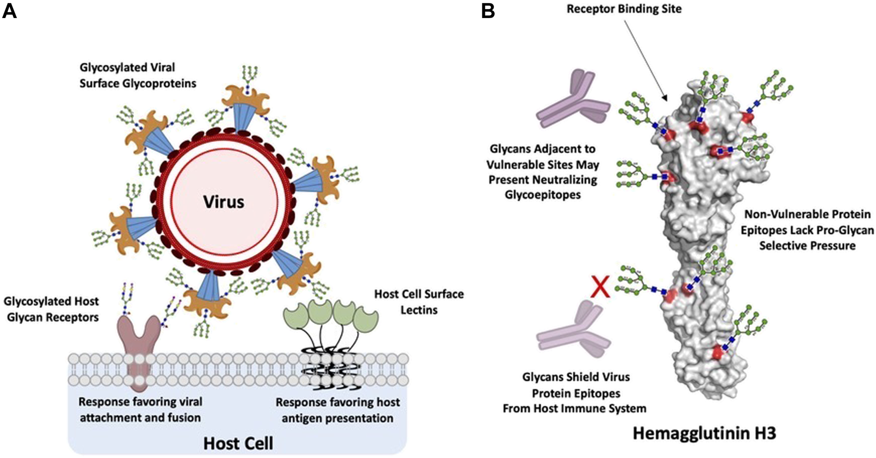 Glycan interactions between host and virus. (A), glycan interactions between host cells and viruses are predominantly mediated by host or virus glycoproteins and their complementary host or virus glycan binding proteins. These binding events trigger processes that favor either viral attachment and fusion or host recognition and response. (B), Hemagglutinin H3 from Influenza A Wyoming/3e/2003, depicted with Man9 glycans and theoretical mAbs for illustrative purposes. Glycans shield vulnerable protein epitopes from neutralizing mAbs, such as the receptor binding site, while non-vulnerable protein epitopes lack selective pressure for glycan shielding. However, these glycans can also present targets as glycoepitopes. Generated in PyMOL from PDB: 6BKN (Wu et al., 2018).