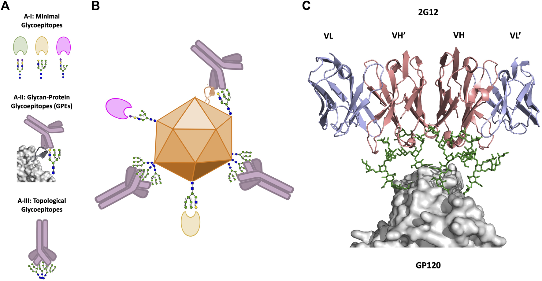 While we have thus far discussed glycans predominantly as beneficial to viral fitness in interactions with the host immune system, glycans may also serve as immune targets (glycoepitopes). We next review three broad types of glycoepitopes, categorized according to the structural-basis for their recognition event (Figure 2A). These types are: 1) minimal glycoepitopes: glycoepitopes recognized chiefly based on their glycan species, typically most effectively by lectins or pattern recognition receptors (Figure 2A-I); 2) glycan-protein glycoepitopes (GPEs): glycoepitopes formed by combinations of glycan and peptide epitopes and recognized by antibodies (Figures 2A-II); and 3) topological glycoepitopes: glycoepitopes occurring at N-glycan clusters with a predisposition for oligomannose, and recognized by unconventional antibodies based on their glycan topology without regard for protein sequence (Figures 2A-III). We focus primarily on the third class, using the anti-HIV mAb 2G12 as the canonical topological mAb to explore the unique features of topological glycoepitopes.