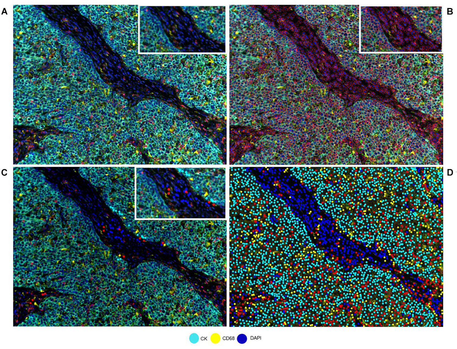 Training a software to individualize the cells is crucial and one of the key steps to obtain accurate data. For this purpose, 4’,6-diamidino-2-phenylindole is useful, and it is used for nuclear quantitation to visualize nuclear DNA in formalin-fixed, paraffin-embedded tissues (Tarnowski et al., 1991). It can be used alone or in combination with membrane markers, such as CD3, or cytoplasmic markers, such as cytokeratin, to better identify and individualize the cells. Modifying parameters, such as nuclear size and nuclear staining thresholds, or using tools that combine such parameters is essential to better identify and individualize cells. Because every tumor and sample are different, adjusting these parameters based on tumor type will probably be necessary (Supplementary Figure 1).