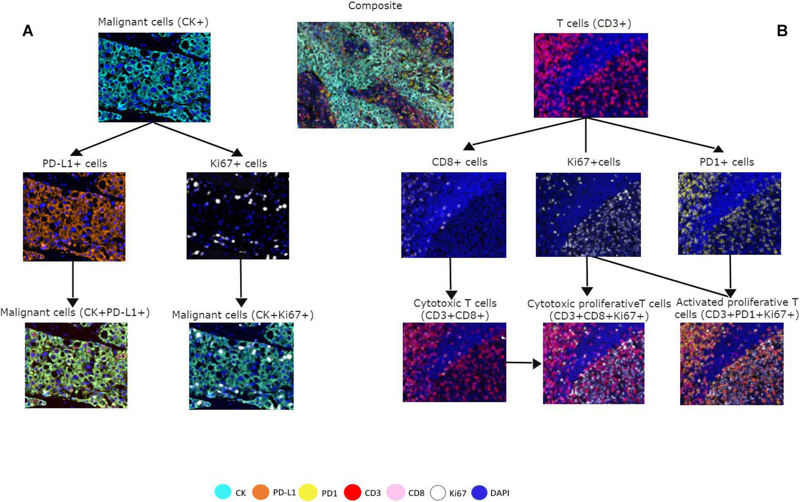 Figure 3. Multiplex immunofluorescence panel showing different cell phenotype co-localizations in tumor and immune cells from a non-small cell lung cancer sample. (A) Marker expression of malignant cells with cytokeratin (CK) and co-localization with PD-L1 + and Ki67 +. (B) Marker expression of CD3 + on immune T-cells, expression of CD8 + cells, expression of PD-1 + cells, and co-localization with CD3 + CD8 + for cytotoxic T-cells, Ki67 + CD3 + CD8 + for cytotoxic proliferative T-cells, and CD3 + Ki67 + PD-1 + for activated proliferative T-cells. The composite image with all the markers is localized in the upper center of the image.