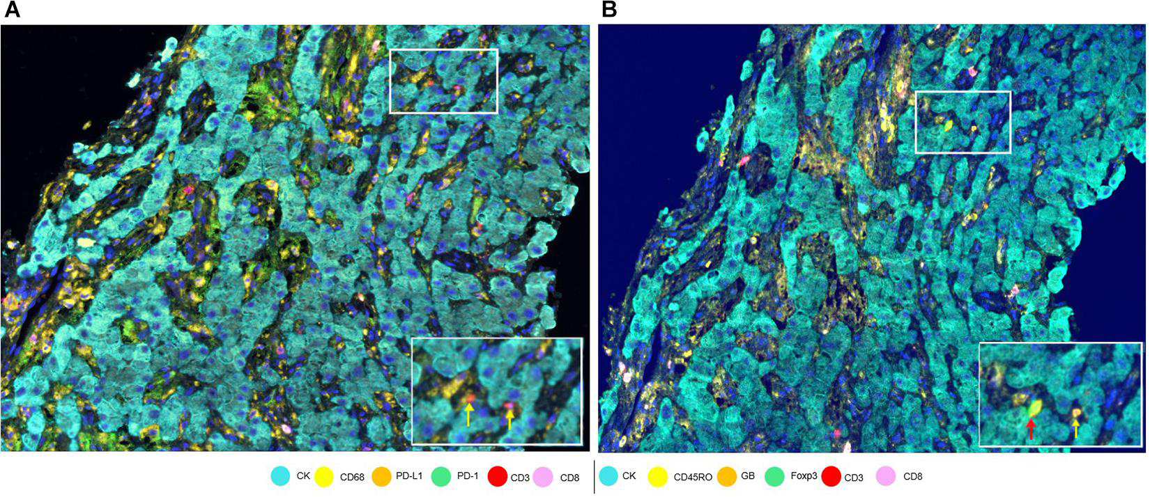 Figure 4. Marker expression in a hepatocellular carcinoma sample. (A) Low-magnification image with white-framed rectangles showing two CD3 + cells (indicated by yellow arrows) seen with high magnification at the bottom right of the panel. (B) Low-magnification image with white-framed rectangles showing the same two CD3 + cells with co-localizations: CD3 + Foxp3 + CD45Ro (indicated by a red arrow) and CD3 + CD45Ro (indicated by a yellow arrow) seen with high magnification at the bottom right of the panel.