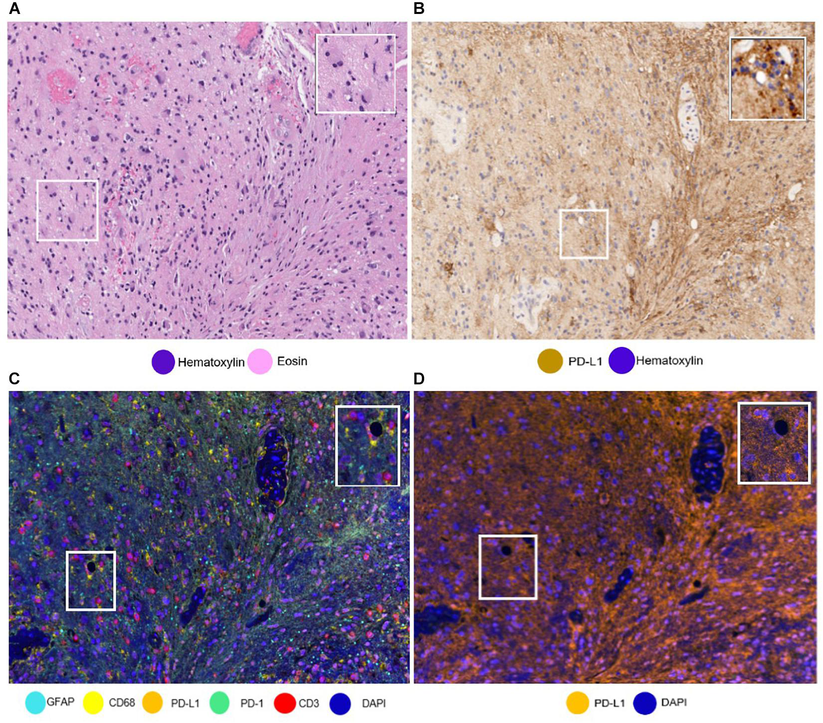 Figure 6. Same areas of a glioblastoma sample with different stainings. The glioblastoma sample stained with (A) hematoxylin and eosin and with (B) PD-L1 immunohistochemistry. It is important to note the challenge to differentiate immune cells from tumoral cells. (C) The glioblastoma sample stained using multiplex immunofluorescence (mIF). Using mIF allows us to differentiate lymphocytes from tumor cells (as seen in 3 CD3 + lymphocytes staining red and glial fibrillar acidic protein staining cyan). (D) mIF with only PD-L1-positive cells. White-framed rectangles in all the images highlight the same area of the sample, which is augmented in the rectangles on the upper right of each panel.