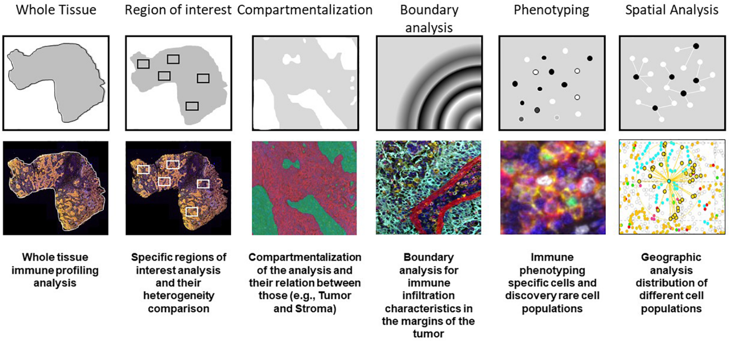 The tumor microenvironment consists of tumor cells, immune cells, fibroblasts, tumor vasculature, and the extracellular matrix. Their interactions can promote tumor transformation, tumor protection from host immunity, tumor growth, and tumor invasion and can foster therapeutic resistance (Yu and Cui, 2018). To determine the effect of the host immune response to tumor formation and invasion, researchers can analyze immune components and their organization within human tumors. Because immune infiltrates differ between tumor types and even between patients, an analysis of the location, density, and spatial orientation of the different immune cell populations in large annotated collections of human tumors allows for the identification of beneficial immune components, as well as those that might indicate a poor prognosis (Fridman et al., 2012; Pilla and Maccalli, 2018).