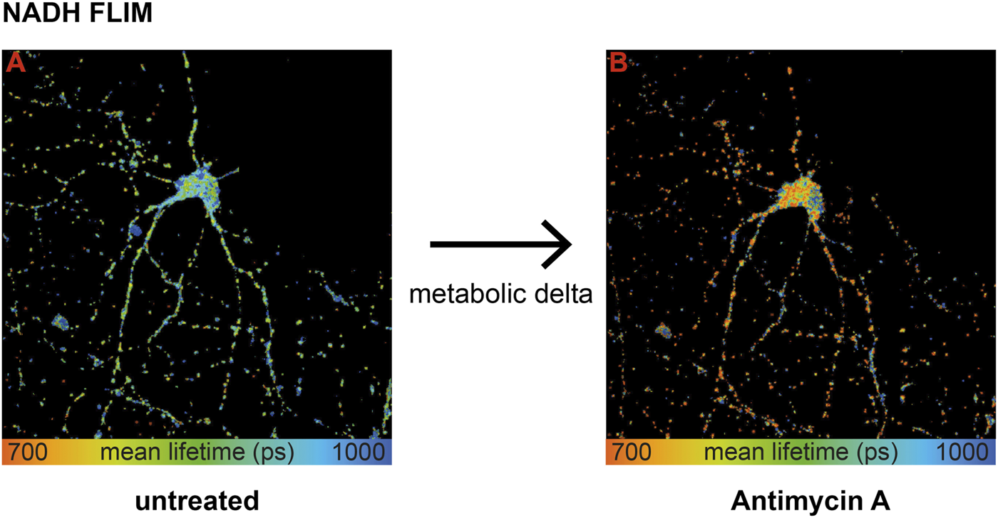 Nicotinamide adenine dinucleotide (NADH) fluorescence lifetime imaging microscopy (FLIM) has been shown to encode mitochondrial function, generally speaking with a longer NADH lifetime corresponding to higher respiration and a shorter NADH lifetime to lower respiration (Lakowicz et al., 1992).