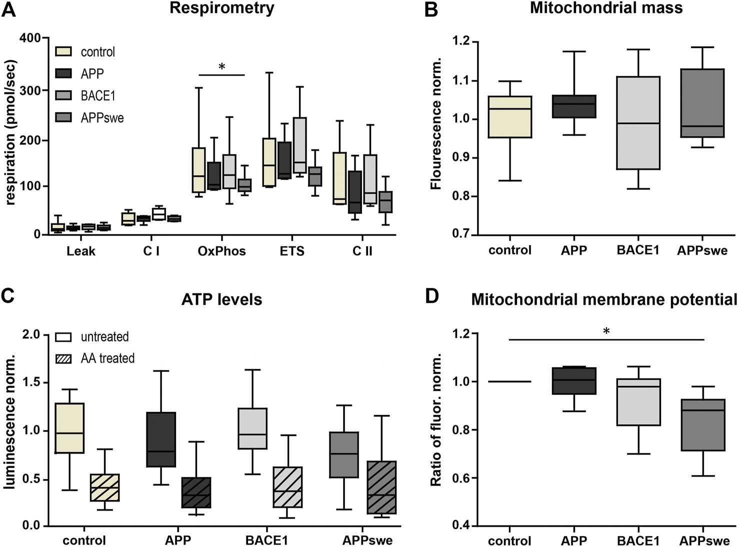In contrast, BACE1 overexpressing neurons did not show a reduced respiration nor does complex I (CI)-respiration in any of the conditions. Next, we measured mitochondrial mass using the well-established Mitotracker Green FM. This did not reveal any significant differences (p = 0.1575) (Figure 2B), indicating that the reduced respiration is not due to a reduced mitochondrial mass. Also, consistent with the respirometry results, the total ATP levels were lower in APPswe neurons (Figure 2C), although this effect did not reach significance (p = 0.09). However, upon acute AA pretreatment, the ATP levels converged (Figure 2C), indicating that mitochondrial ATP production is reduced in APPswe neurons (Supplementary Figure S1D). Likewise, mitochondrial membrane potential decreased significantly (p = 0.03) in APPswe neurons (Figure 2D).