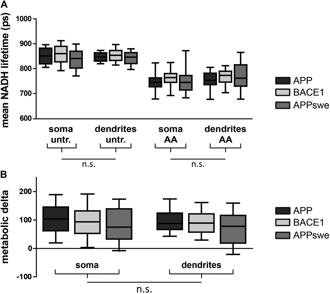 Next, we aimed at comparing NADH FLIM to the biochemical metabolic characterization in primary neurons overexpressing APP, BACE1, and APPswe. The mean NADH fluorescent lifetimes show the expected decrease upon AA treatment but are not significantly different between the overexpressed proteins or between soma and dendrites (Figure 3A). Calculating the metabolic delta as the difference between untreated and AA-treated neurons reveals a trend toward a lower metabolic delta in APPswe (Figure 3B), resembling the trends seen for the respirometry measurements (Figure 2A). One explanation for the minor effect size in bulk NADH FLIM compared to respirometry could be alterations in mitochondrial matrix pH (Schaefer et al., 2018).