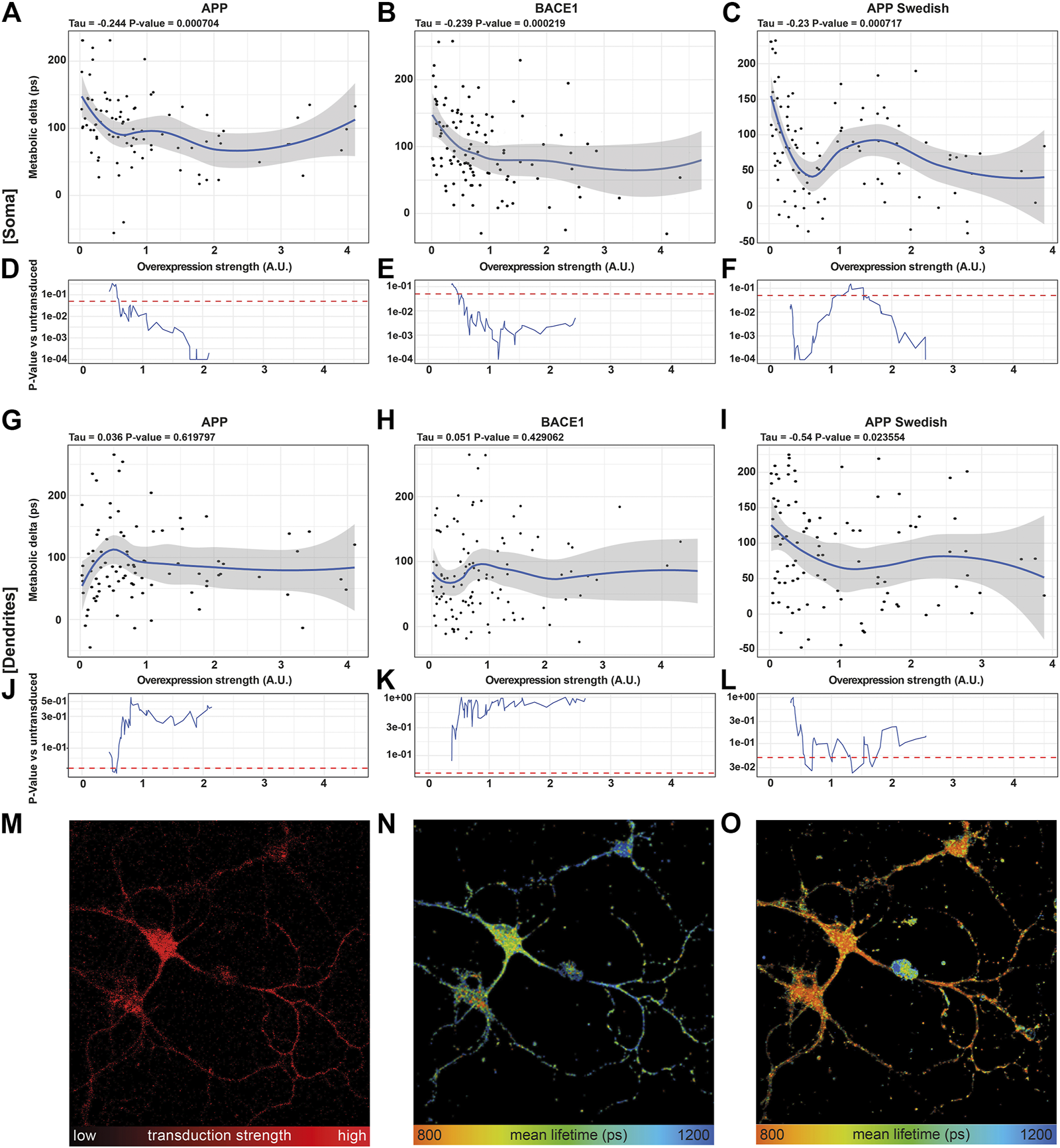 NADH FLIM Metabolic Delta shows dose-mitochondrial respiration correlates with APPswe overexpression strength in a dose-dependent manner. (A–C, G–I) Correlations of the metabolic delta in somatic (A–C) and dendritic regions (G–I) with the overexpression strength of APP (soma: τ = −0.244, p = 0.0007, dendrites τ = 0.036, p = 0.619,797), BACE1 (soma: τ = −0.239, p = 0.0002, dendrites: τ = −0.051, p = 0.429,062), and APPswe (soma: τ = −0.231, p = 0.0007, dendrites: τ = −0.54, p = 0.023,554), quantified as mCherry fluorescence intensity of APP (A), BACE1 (B), and APPswe (C) neurons on the single-cell level (n = 5, > 120 neurons). The blue line represents a local regression (loess) curve to visualize the nonlinear regression. (D–F, J–l) Significance indicated as p-value [p] vs. the 21 least transduced neurons was evaluated using a sliding window and a permutation test and plotted in (D–F, J–O). A representative image section of BACE1 neurons underlining the decrease in the metabolic delta with increasing overexpression strength. (M) Overexpression strength is displayed as the mCherry fluorescence intensity. NADH FLIM before (N) and after AA treatment (O) are false-color coded with the corresponding color palette shown below.