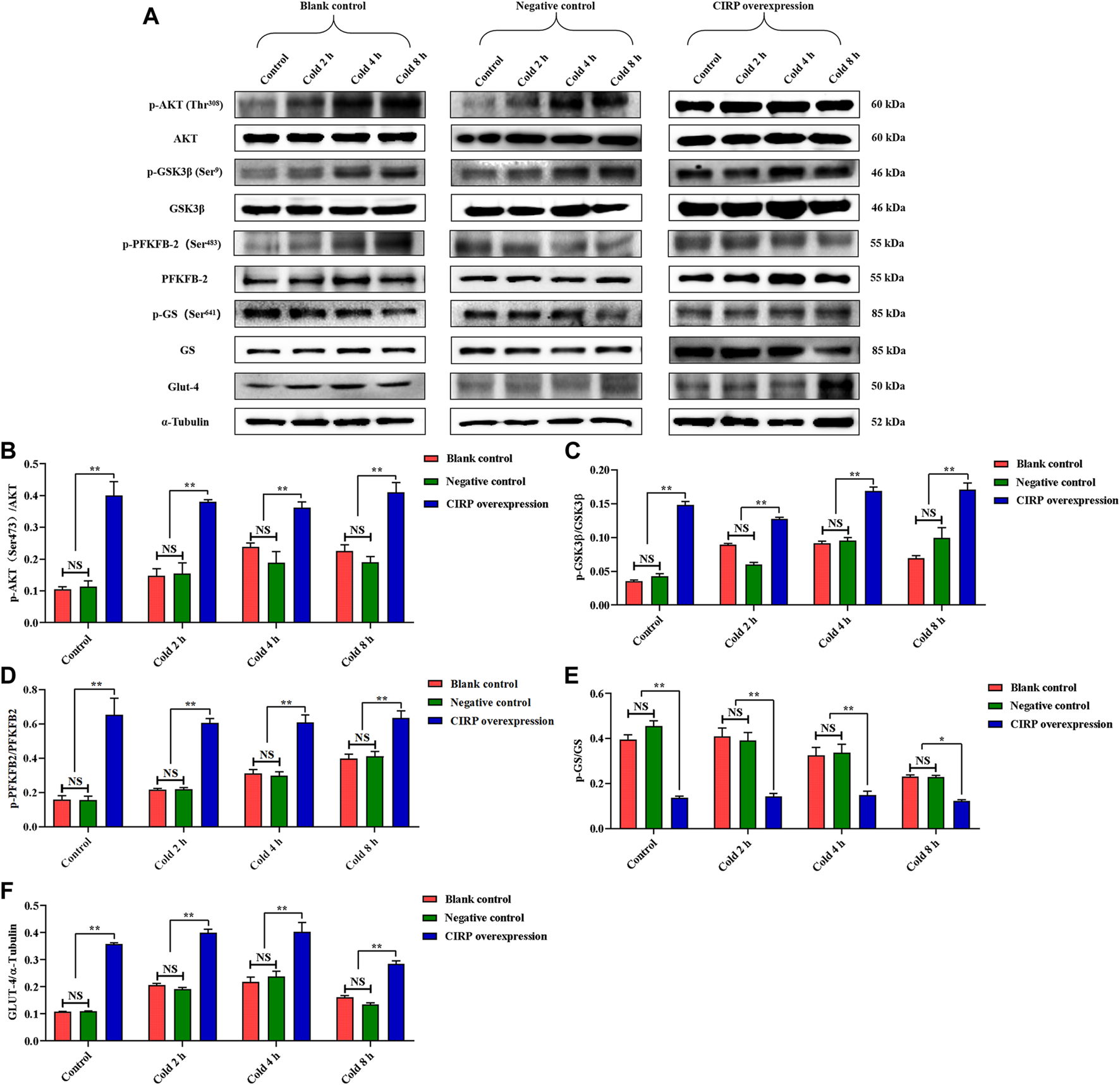 Effects of mild hypothermia and CIRP overexpression on AKT and downstream glucose metabolism pathways. (A) Western blotting results of glucose metabolism related proteins in each group. The protein expression levels and phosphorylation status of AKT (B), GSK3β (C), PFKFB2 (D), GS (E) and GLUT-4 (F) in C2C12 cells. The data are presented as the mean ± SEM (n = 8). Statistically significant differences are indicated; *p < 0.05, **p < 0.01. AKT, protein kinase B; GSK3β, glycogen synthase kinase-3β; PFKFB2, 6-phosphofructo-2-kinase/fructose-2,6-biphosphatase 2; GS, glycogen synthase; GLUT-4, glucose transporter-4.
