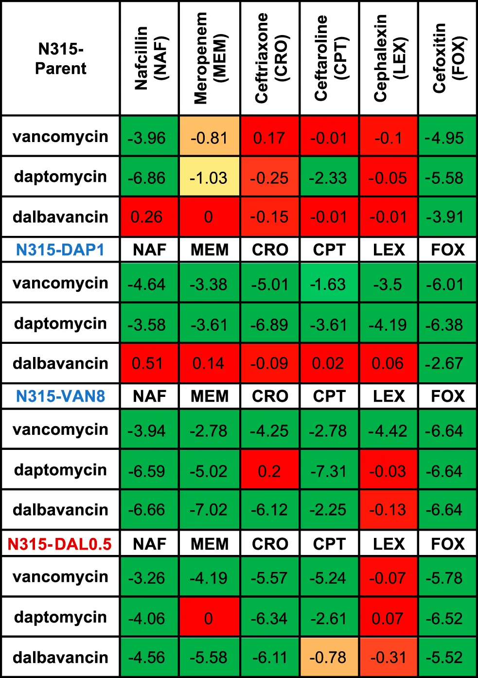 Susceptibility of each of the N315-derived strains are listed in Table 1. As shown in the table, N315-DAP1 exhibited strong seesaw effect with cephalexin and nafcillin, with 8 and 6-log2 fold-change in MIC, respectively, compared to the N315 parent strain. N315-Van8 strain, aside from the above 2 beta-lactams inducing 5 log2 fold-change, ceftriaxone also showed significant decreases in MIC with 3 log2 fold-change relative to the parent. For N315-Dal0.5 strain, no general seesaw effect was observed in our susceptibility testing, notably, ceftriaxone and nafcillin even displayed increased MICs. Generally there was cross-resistance among VAN/DAL/DAP similar to what has been reported previously (Hines et al., 2020).