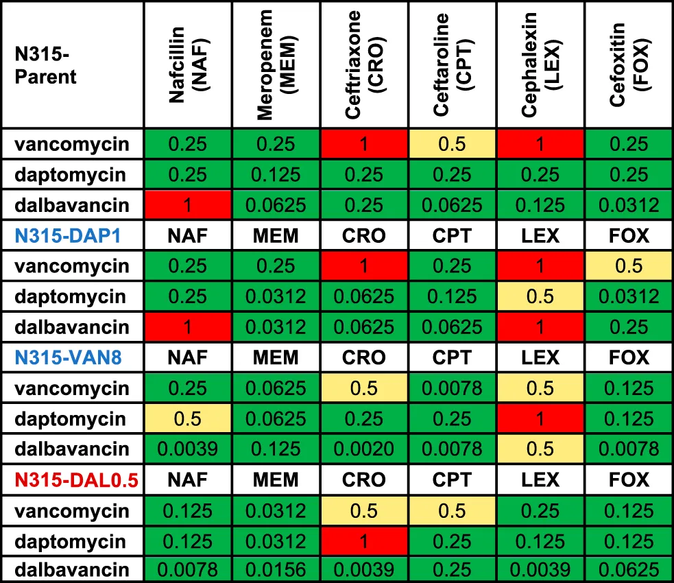 Strains used in this study and their antibiotic susceptibility and genetic profiles. The seesaw effect was most pronounced with cephalexin (LEX) and nafcillin (NAF) across the 3 mutant strains. Vancomycin (VAN), daptomycin (DAP), dalbavancin (DAL), nafcillin (NAF), cephalexin (LEX), meropenem (MEM), ceftriaxone (CRO), cefoxitin (FOX), ceftaroline (CPT).