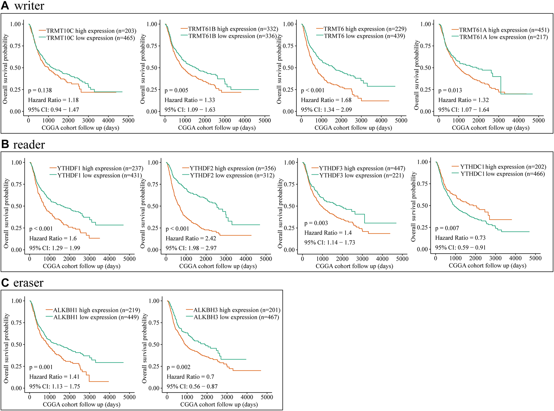 FIGURE 2. Prognostic value of the m1A regulators in glioma according to CGGA database. (A–C) Kaplan–Meier analysis showing the correlation between m1A “writers” expression levels and the glioma patients overall survival rates according to CGGA database.