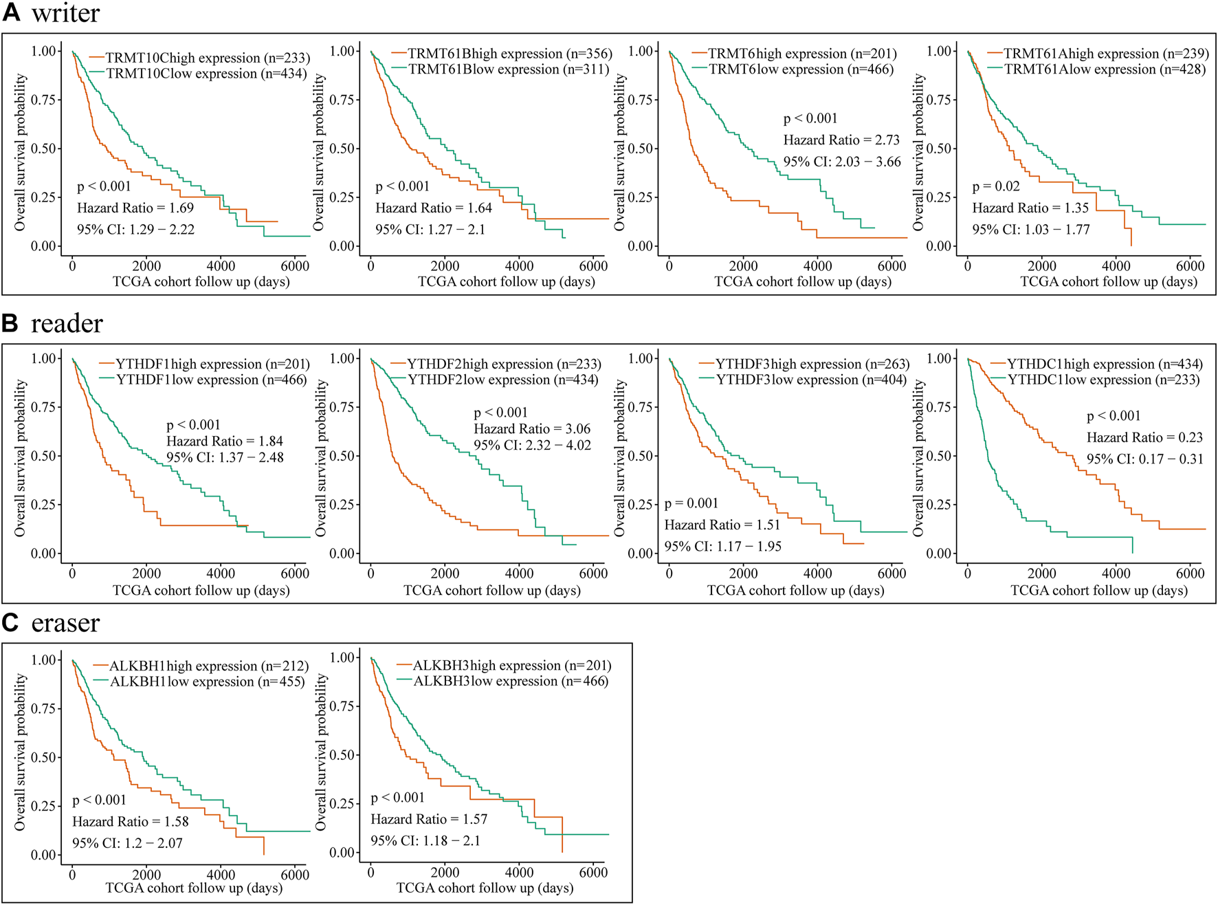 FIGURE 3. Prognostic value of the m1A regulators in glioma based on TCGA dataset. (A–C) Kaplan–Meier analysis showing the correlation between m1A “writers,” “readers,” and “erasers” expression levels and the glioma patients overall survival rates based on TCGA dataset.