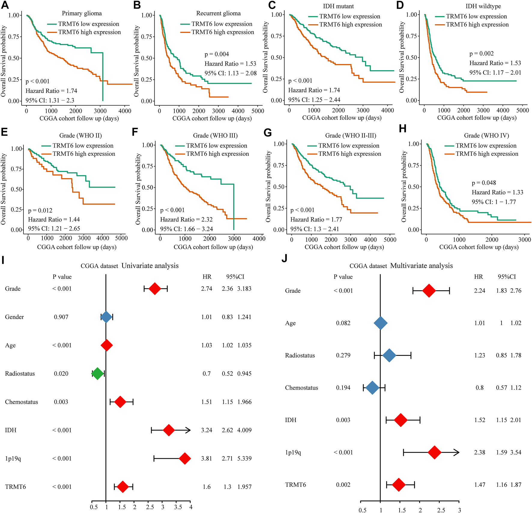FIGURE 4. Prognostic value of the TRMT6 in glioma. (A–H) Kaplan–Meier overall survival curves of TRMT6 for patients in the CGGA dataset stratified by recurrence, WHO grade and IDH mutation statuses. (I–J) Univariate and multivariate Cox regression analyses showed that TRMT6 was an independent prognostic risk factor in CGGA dataset.
