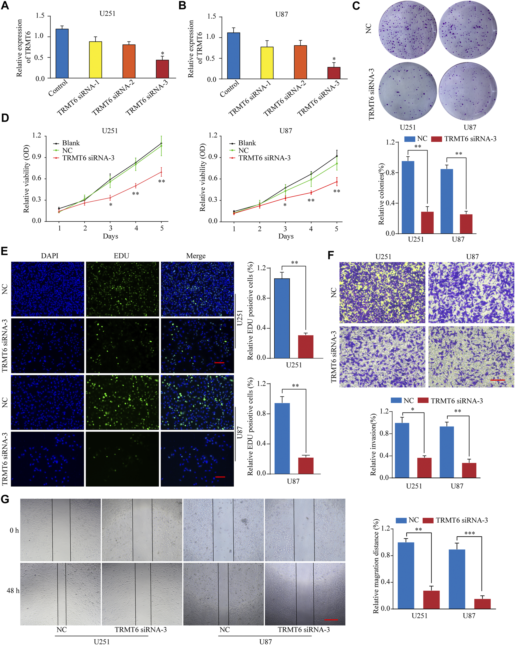 FIGURE 5. TRMT6 silencing inhibits glioma cell proliferation, migration, and invasion. (A, B): qRT-PCR analysis of TRMT6 expression in glioma cells after transfection with control or TRMT6 siRNAs. (C): Knockdown of TRMT6 dramatically inhibited the cell colony formation ability. (D): Cell proliferation of U251 or U87 cells transfected with NC or TRMT6 siRNA was analyzed by CCK-8 assay. (E): Cell proliferation of U251 or U87 cells transfected with NC or TRMT6 siRNA was analyzed by EdU staining assay. Scale bar, 50 μm. (F): Decreased TRMT6 inhibited U251 or U87 cell invasion ability. Scale bar, 50 μm. (G): Decreased TRMT6 inhibited U251 or U87 cell migration ability. Scale bar, 50 μm *p < 0.05, **p < 0.01, ***p < 0.001.
