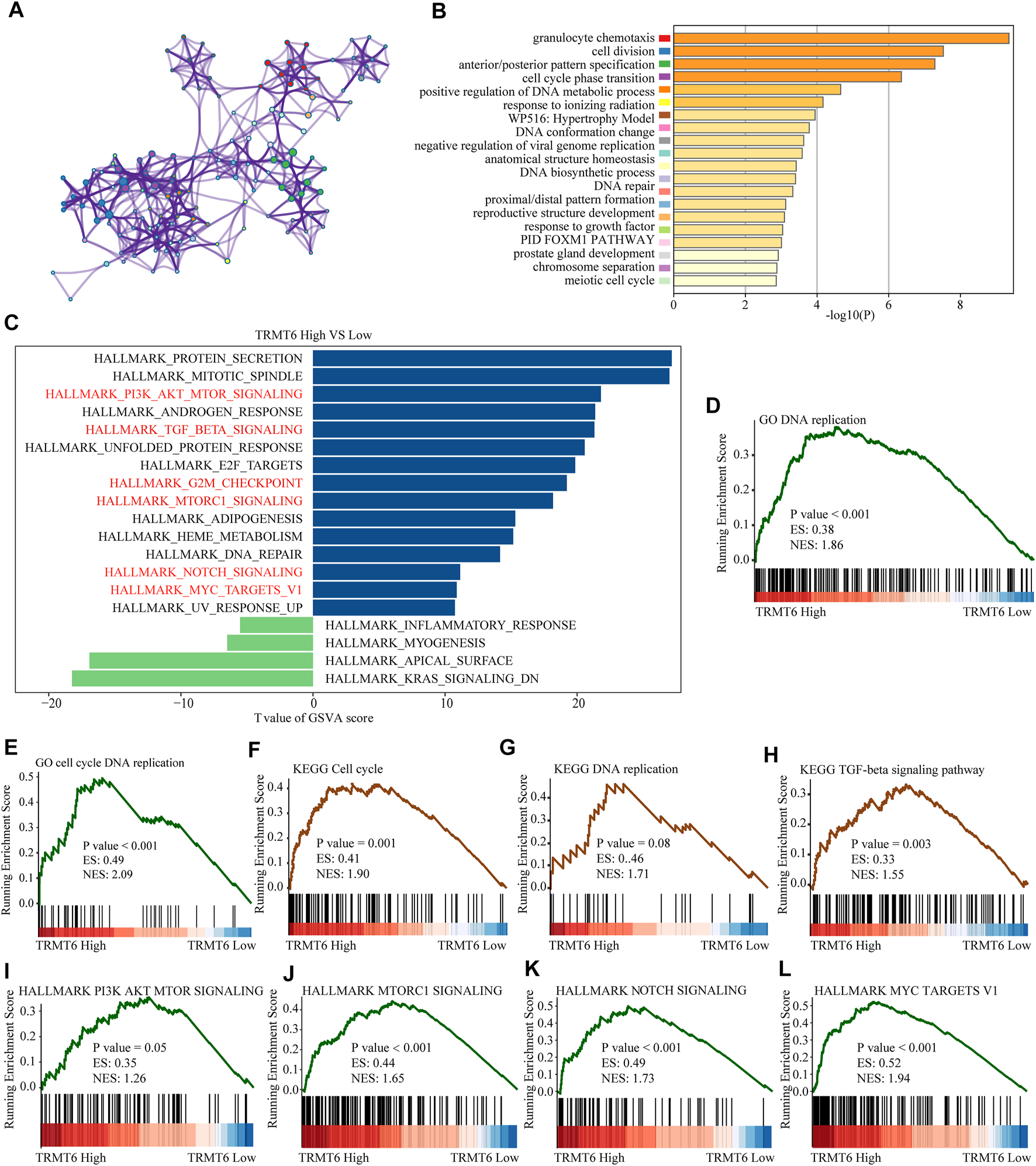 To further explore the underlying mechanism of the oncogenic effect of TRMT6 in glioma, we further explored whether patients with different TRMT6 expression statuses had different biological behaviors. The top 200 most significantly upregulated genes of patients with high TRMT6 expression based on the p-value were selected to annotate the biological function. The results showed that the inflammatory signaling pathway (granulocyte chemotaxis and PID FOXM1 pathways) and cell cycle pathway (cell division, meiotic cell cycle, chromosome separation, and DNA biosynthetic processes) were significantly enriched in TRMT6-upregulated patients. The top 20 significantly enriched biological pathways are presented in Figures 6A–B. Similarly, GSVA and GSEA analyses further indicated that the cell cycle, PI3K-AKT, TGF-beta, MTORC1, NOTCH, and MYC pathways were significantly enriched in high–TRMT6 expression patients (Figures 6C–L). Overall, these findings showed that TRMT6 might be involved in glioma progression by regulating cell cycle, PI3K-AKT, TGF-beta, MTORC1, NOTCH, and MYC pathways.