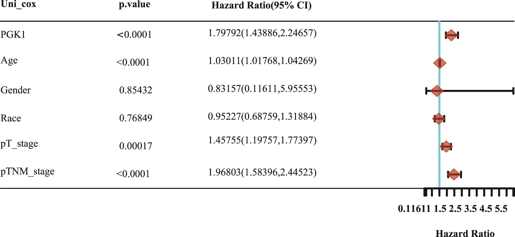 TABLE 6. Hazard ratio and p-value of constituents involved in univariate Cox regression and some parameters of the PGK1 gene.