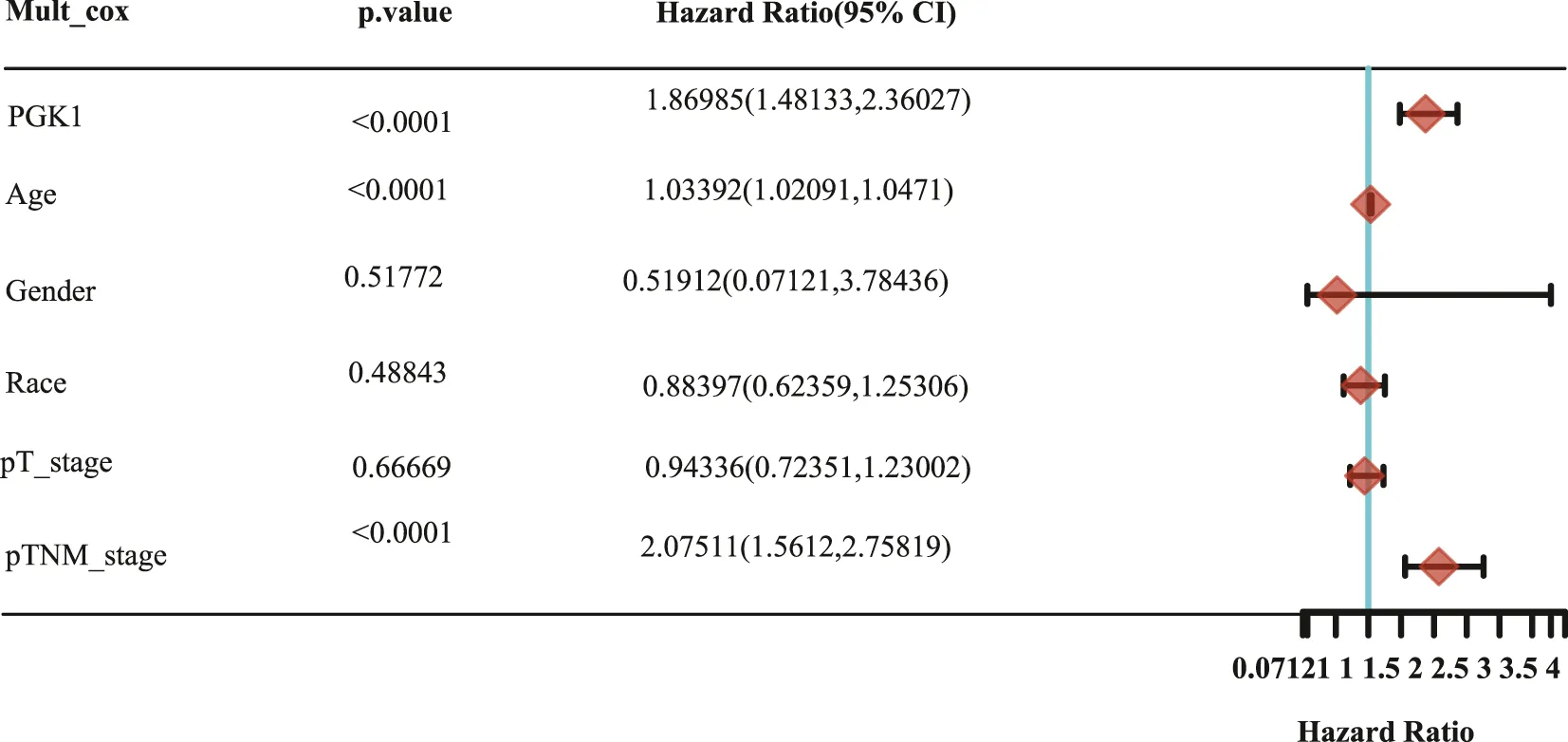 TABLE 7. Hazard ratio and p-value of constituents involved in multivariate Cox regression and some parameters of the PGK1 gene.