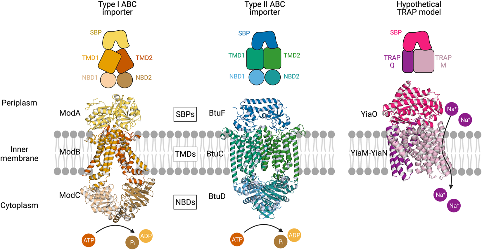 Multicomponent transporters. Left, an experimentally determined structure of the type I ABC importer ModBC-A from A. fulgidus (PDB ID: 2ONK). Middle, an experimentally determined structure of the type II ABC importer BtuCD-F from E. coli (PDB ID: 2QI9) (Hollenstein et al., 2007; Hvorup et al., 2007). Right, a hypothetical model of the TRAP transporter YiaMN-O from E. coli that was generated by Ovchinnikov et al. (2014) using comparative modelling in RosettaCM. The substrate-binding proteins (SBPs) dock to the transmembrane domains (TMDs) at the periplasmic surface of the inner membrane. ABC transporter nucleotide-binding domains (NBDs) situated in the cytoplasm catalyse the hydrolysis of ATP. The TRAP transporter facilitates the movement of sodium ions across the membrane.