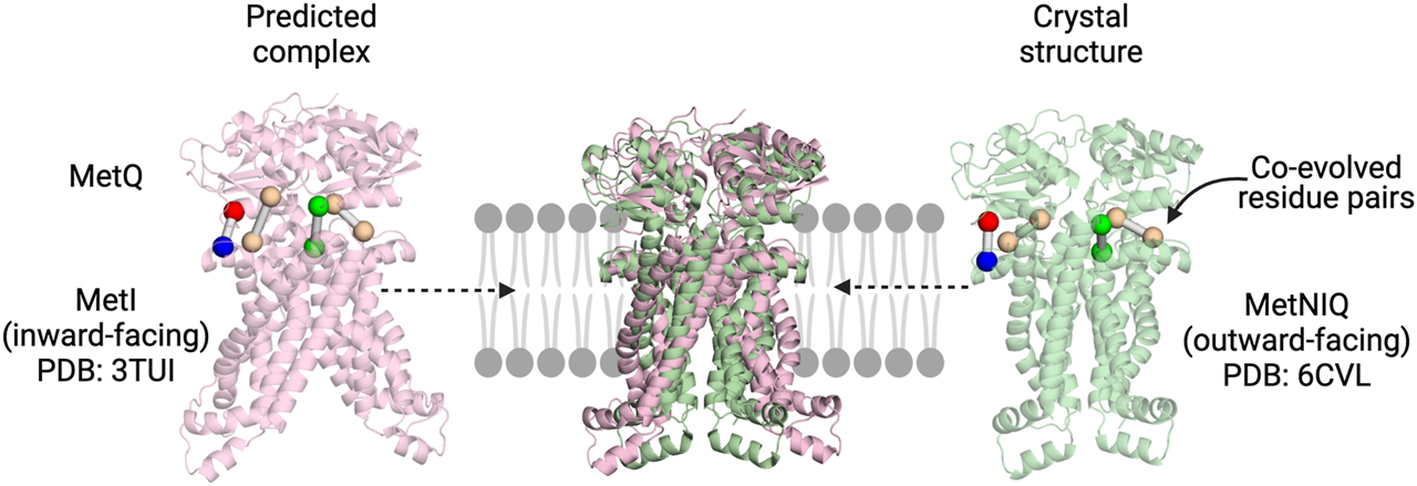 Co-evolution analysis as a tool to explore SBP:TMD interactions in multicomponent systems. The predicted MetIQ structure (Ovchinnikov et al., 2014) maps well on to the MetNIQ crystal structure (MetN not displayed) (Nguyen et al., 2018). The top co-evolved residues between the two components are in similar positions, with the predicted complex correctly orienting the SBP.