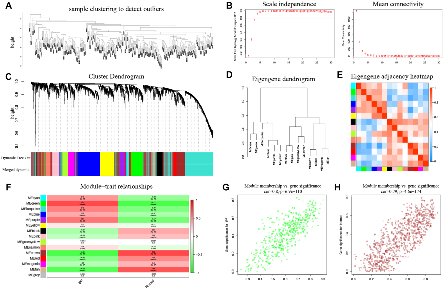Key modules identified by WGCNA in the training group. (A) Sample clustering to detect outliers. (B) Determination of soft-thresholding power. (C) Clustering dendrogram. Both of the original and the merged modules were presented. (D) Dendrogram of consensus module eigengenes obtained from WGCNA on the consensus correlation. (E) Dendrogram of merged module eigengenes obtained from WGCNA. (F) The module-trait relationships were evaluated by correlating module eigengenes with clinical traits. (G) Scatter plots of module eigengenes in the green modules. (H) Scatter plots of module eigengenes in the brown modules.