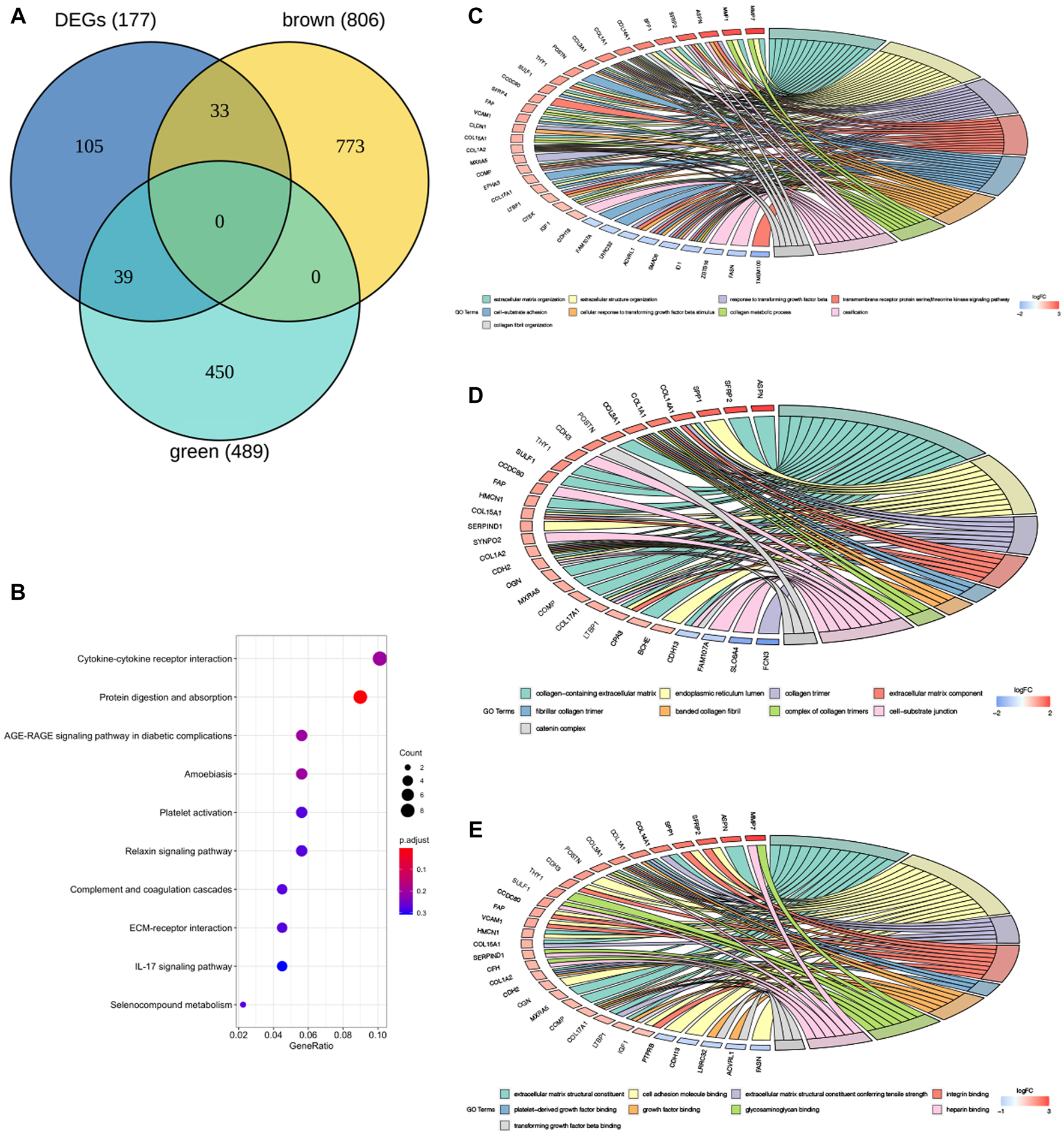 A total of 177 DEGs, including 121 up-regulated and 56 down-regulated genes, were identified in the training group (Figures 3A,B, Table 3). Among them, 72 genes were determined as key genes because they were shared by the green and brown modules (Figure 4A and Table 4). KEGG analysis revealed that the most notably enriched pathways were protein digestion and absorption and focal adhesion (Figure 4B, Supplementary Table S1). GO analysis showed that these genes were mainly involved in nine cellular components (Figure 4D), nine molecular functions (Figure 4E), and nine biological processes, including extracellular matrix organization (CCDC80, COL14A1, COL15A1, COL17A1, COL1A1, COL1A2, COL3A1, COMP, CTSK, FAP, MMP1, MMP7, POSTN, SFRP2, SPP1, SULF1, and VCAM1), extracellular structure organization (CCDC80, COL14A1, COL15A1, COL17A1, COL1A1, COL1A2, COL3A1, COMP, CTSK, FAP, MMP1, MMP7, POSTN, SFRP2, SPP1, SULF1, and VCAM1), response to TGF beta (ACVRL1, ASPN, CLDN1, COL1A1, COL1A2, COL3A1, ID1, LRRC32, LTBP1, MXRA5, POSTN, SMAD6), and others (Figure 4C), indicating that these genes could play important roles in the occurrence of IPF through influencing these biological processes and molecular functions.