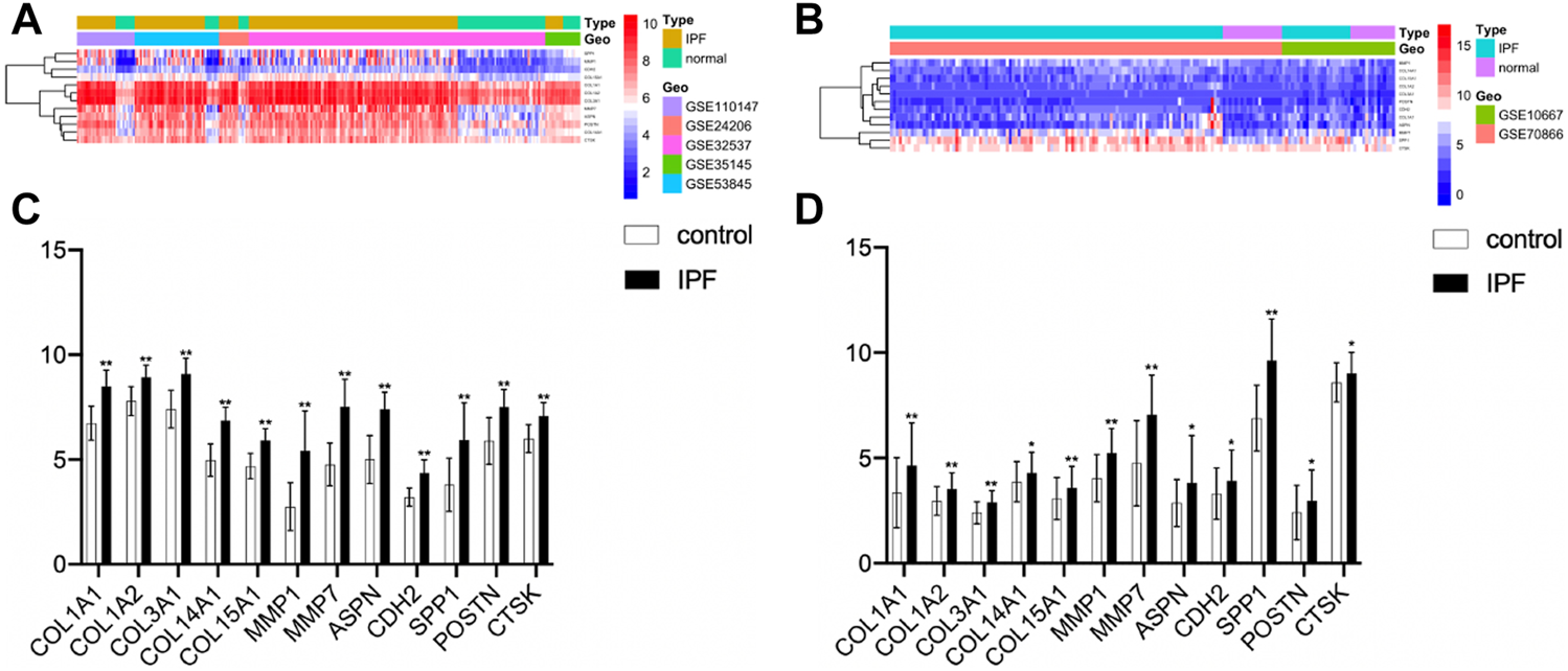 In the present study, multiple bioinformatic methods were used to search for hub genes significantly correlated with the occurrence and prognosis of IPF. Their expression has also been validated using quantitative real-time PCR (qRT-PCR). This work will provide further insights into the underlying molecular mechanisms of IPF and potential molecular targets for developing novel interventional strategies.