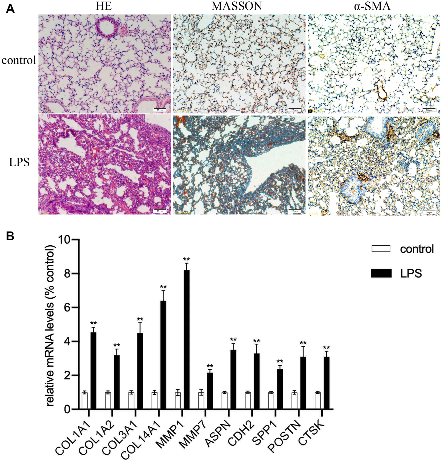 Lung tissue collected from both control and LPS injected mice was fixed in 4% paraformaldehyde solution for overnight, followed by dehydration in 70% ethanol and embedding in the paraffin wax. 5 μm thick sections were cut and subject to H&E and Masson’s trichrome staining, respectively, as previously described (Wan et al., 2019). Expression of α-SMA in the lung tissue was evaluated using immunohistochemical staining. Sample sections were deparaffinized and incubated with 5% goat serum containing 0.1% Triton X-100 at room temperature for 2 h, followed by sequential incubation in the primary (rabbit anti-α-SMA, 1:2000, CST, Cat No 19245) and secondary antibody solutions (goat anti-rabbit IgG, 1:1000, Jackson Immunoresearch Laboratory, Cat No 111-035-003) antibodies, each for 2 h. After 3 rinses with 1x PBS, the sections were incubated in a 3,3,-diaminobenzidine (DAB) reaction complex (Vector lab, Burlingame, CA, United States) until an optimal colour developed. At the end of the procedure, the sections were mounted and dehydrated before being coverslipped.