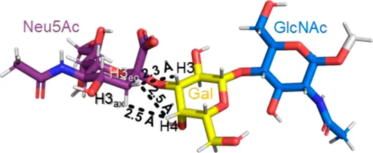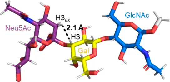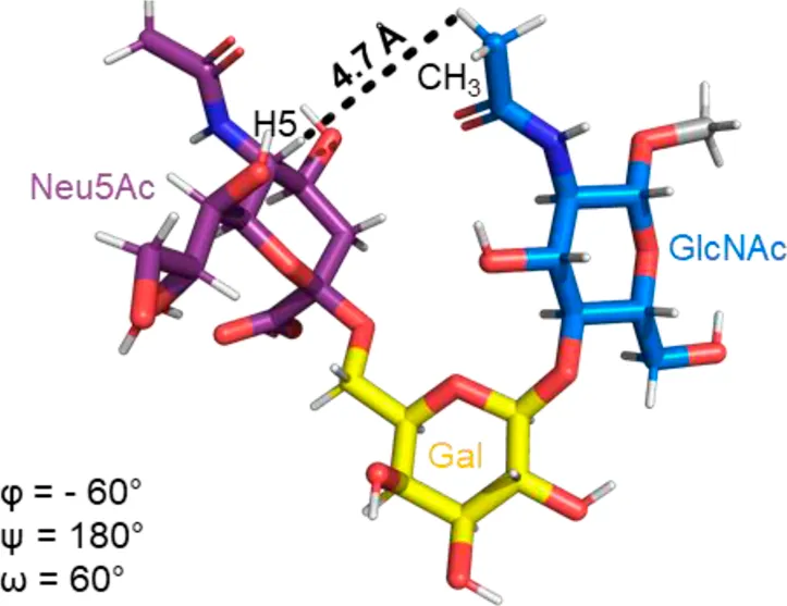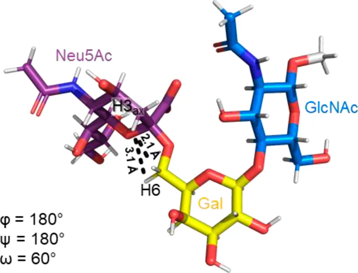 | NMR evidence | H3axNeu5Ac-H6 R/S Gal (Strong/Medium NOE) | H5 Neu5Ac-CH3 GlcNAC (Weak NOE) | |