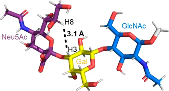 Finally, modifications in the C9 and N-acetylation of the Neu5Ac only cause local modifications and do not induce changes in the torsion angles of the α2,3-glycosidic bond or any difference in the secondary structure (Li et al., 2020).