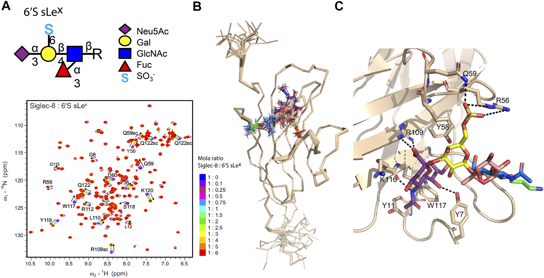 Human siglec-8/6′S sLex complex deduced by the NMR and molecular modeling. (A). 1H,15N-HSQC based titration of siglec-8 with increasing amounts of 6′S sLex. The successive 1H,15N spectra of siglec-8 collected after the gradual addition of 6′S sLex are superimposed. The spectrum of siglec-8 in the absence of 6′S sLex is displayed in dark blue, and the spectrum of siglec-8 in the presence of 6 equivalents of 6′S sLex is displayed in red. The most perturbed residues are identified, and the directions of the peak’s shifts are indicated with arrows. (B). An ensemble of the 20 structures with the lowest energy of siglec-8 complexed with 6′S sLex determined by NMR. (C). Representation of the siglec-8/6′S sLex interface, where the 6′S sLex and the interacting amino acids are displayed as sticks and the hydrogen bonds between Neu5Ac/Gal 6′-sulfated and siglec-8 are illustrated as dashed lines. Adapted from Pröpster et al. (2016).