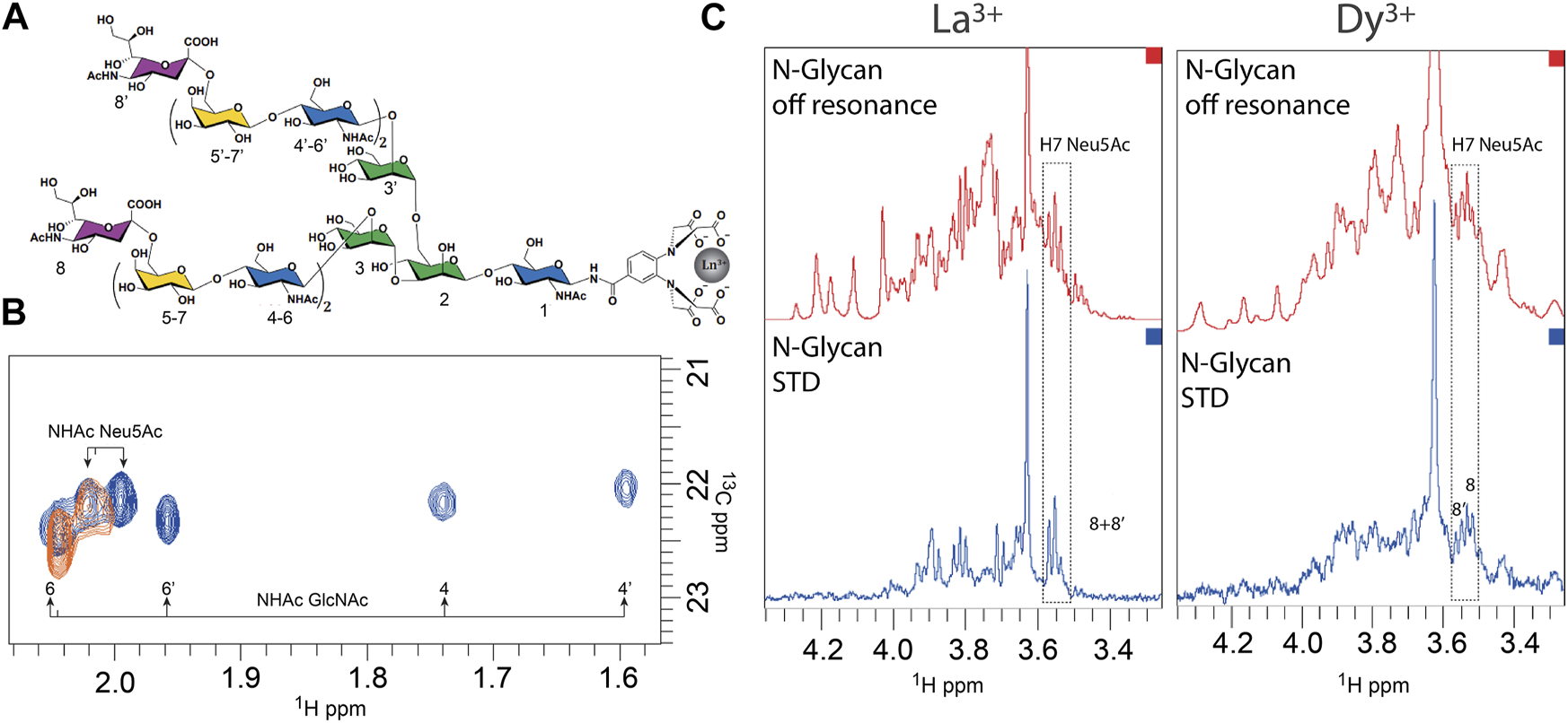 Recognition of a complex N-glycan by the hemagglutinin from HK/68 H3N2 influenza virus deciphered by NMR (Fernández de Toro et al., 2018). (A). Structure of the N-glycan with the corresponding numbering of the 14 monosaccharides. (B). Superimposition of 1H–13C HSQC spectra in the region of the NHAc methyl group of GlcNAc and Neu5Ac of the N-glycan loaded with La3+ (diamagnetic, in orange) and with Dy3+ (paramagnetic, in blue). (C). STD–NMR experiment of N-glycan in the presence of La3+ (diamagnetic conditions, left) and loaded with Dy3+ (paramagnetic conditions, right). Adapted from Canales et al. (2017).