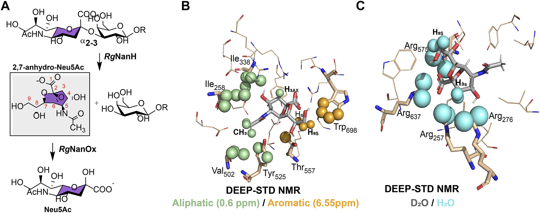 Metabolism and recognition of sialic acid structures by Ruminococcus gnavus ATCC 29149 strain. (A). Schematic representation of the enzymatic processing of α2,3-linked sialic acid compounds to 2,7-anhydro-Neu5Ac by RgNanH and reversible conversion of 2,7-anhydro-Neu5Ac to Neu5Ac by RgNanOx. (B) and (C). Differential epitope mapping of 2,7-anhydro-Neu5Ac in complex with RgNanH-GH33. The crystal structure of the complex (PDB ID: 4 × 4A) (Tailford et al., 2015b). (B). DEEP–STD map (0.60/6.55 p.p.m) of 2,7-anhydro-Neu5Ac. Green spheres highlight ligand contacts with aliphatic side chains, and orange spheres represent contacts with aromatic side chains. (C). DEEP–STD map (D2O/H2O) of 2,7-anhydro-Neu5Ac. Cyan spheres show ligand contacts with protein side chains carrying slow exchanging protons. Adapted from Monaco et al. (2017).