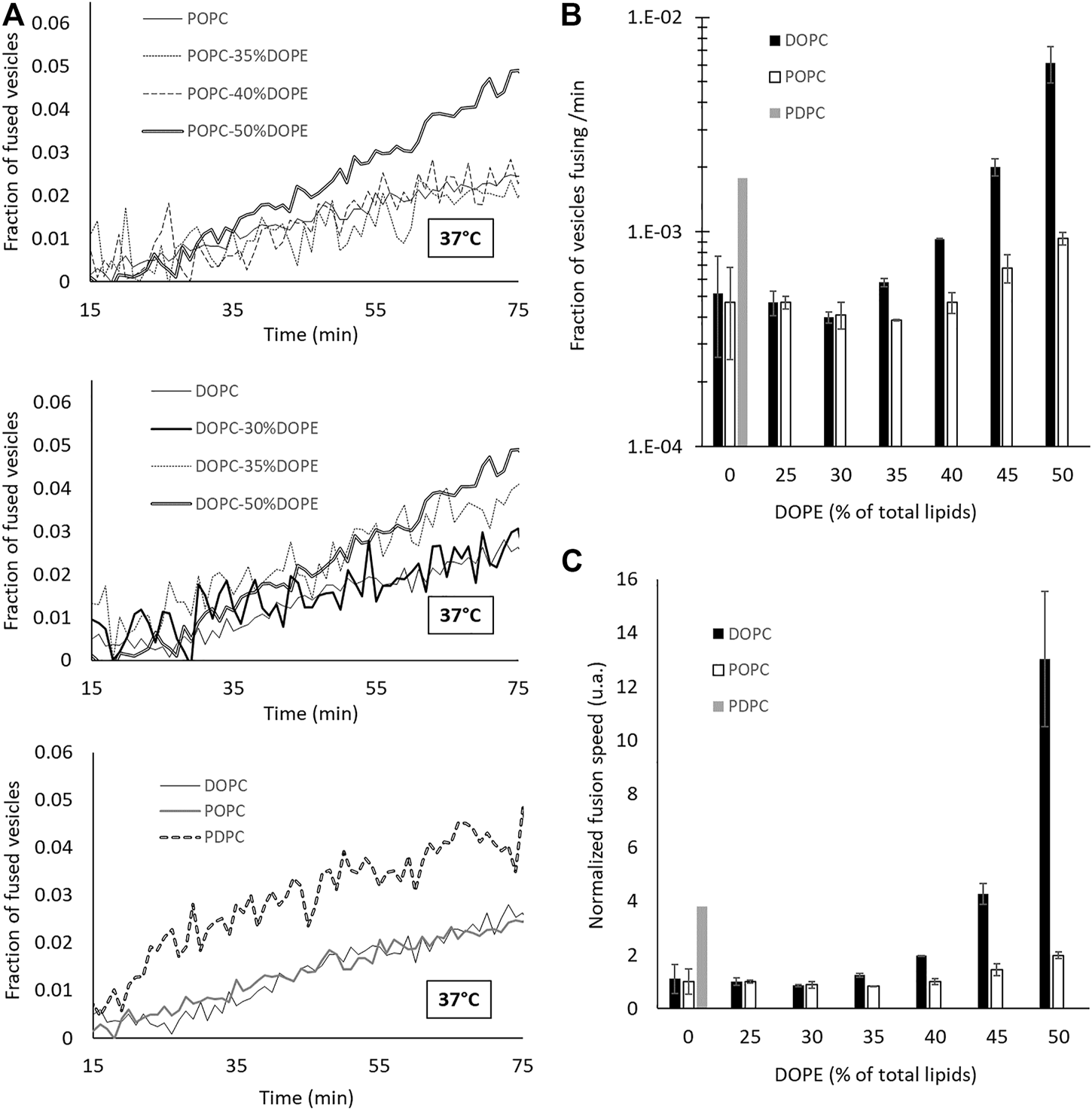 FIGURE 2. Adding DOPE in a phosphatidylcholine (PC) membrane or increasing the degree of unsaturation of the PC tails leads to an increase of the fusion speed. (A) Dequenching curves at 37 °C for different lipid compositions. For the sake of clarity, not all the intermediate curves are represented. However, all the data are presented in (B,C). (B–C) Speed of fusion (in fraction of the total vesicles which undergo a fusion event in 1 minute) for different compositions on a semi-log scale (B) and on a linear scale with values normalized by that of pure POPC fusion speed (C).
