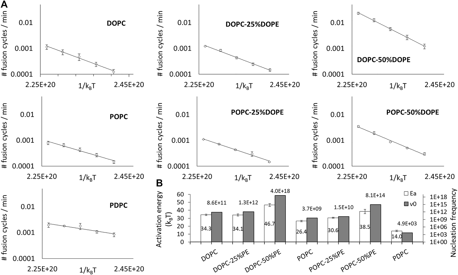At the molecular level, many pathways can be envisioned for the fusion process which make the resulting energy landscape difficult to accurately apprehend. A simplified view in which the molecular details are averaged is probably the best approach to provide a good description of the fusion kinetics. We recently showed experimentally on membranes made of a single lipid type (DOPC or POPC, see Material and Methods for the definition of lipid acronyms) that the fusion kinetics are well-described by an Arrhenius law, i.e. that the energy landscape for fusion can be approximated by a single energy barrier over a range of physiologically relevant temperatures (27°C–47°C) (François-Martin et al., 2017). The corresponding activation energy, about 30 kBT, is high enough to prevent spontaneous fusion but sufficiently low to be tunable by proteins for rapid fusion.