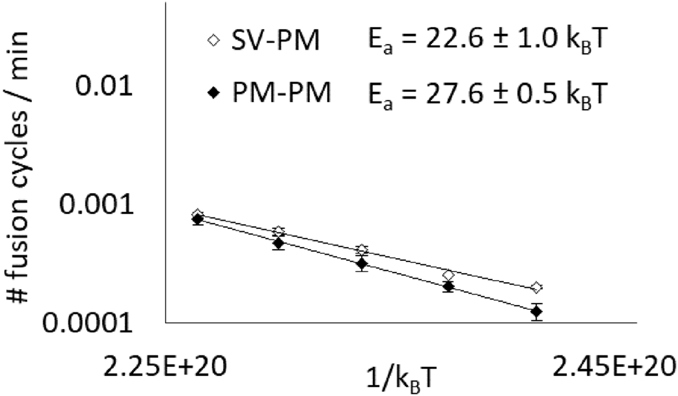 We therefore decided to study a more physiological fusion event and mimicked the fusion that takes place between a synaptic vesicle and the plasma membrane of a neuron during exocytosis of neurotransmitters. We measured the activation energy of the fusion taking place between synaptic vesicle-type vesicles (SV), based on the lipid composition of rat synaptic vesicles (Takamori et al., 2006) and plasma membrane-type vesicles (PM), relying on average plasma membranes (van Meer et al., 2008).