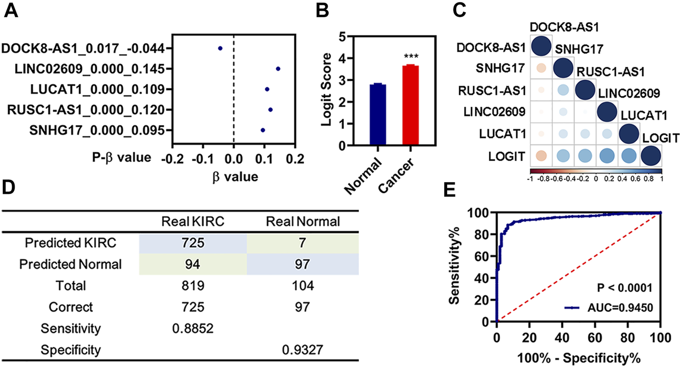 The diagnostic model was constructed using the candidate signatures, as follows (Tang et al., 2020): Logit score = 0.675 + −0.044 * Exp(DOCK8-AS1) + 0.095 * Exp(SNHG17) + 0.120 * Exp(RUSC1-AS1) + 0.145 * Exp(LINC02609) + 0.109 * Exp(LUCAT1).