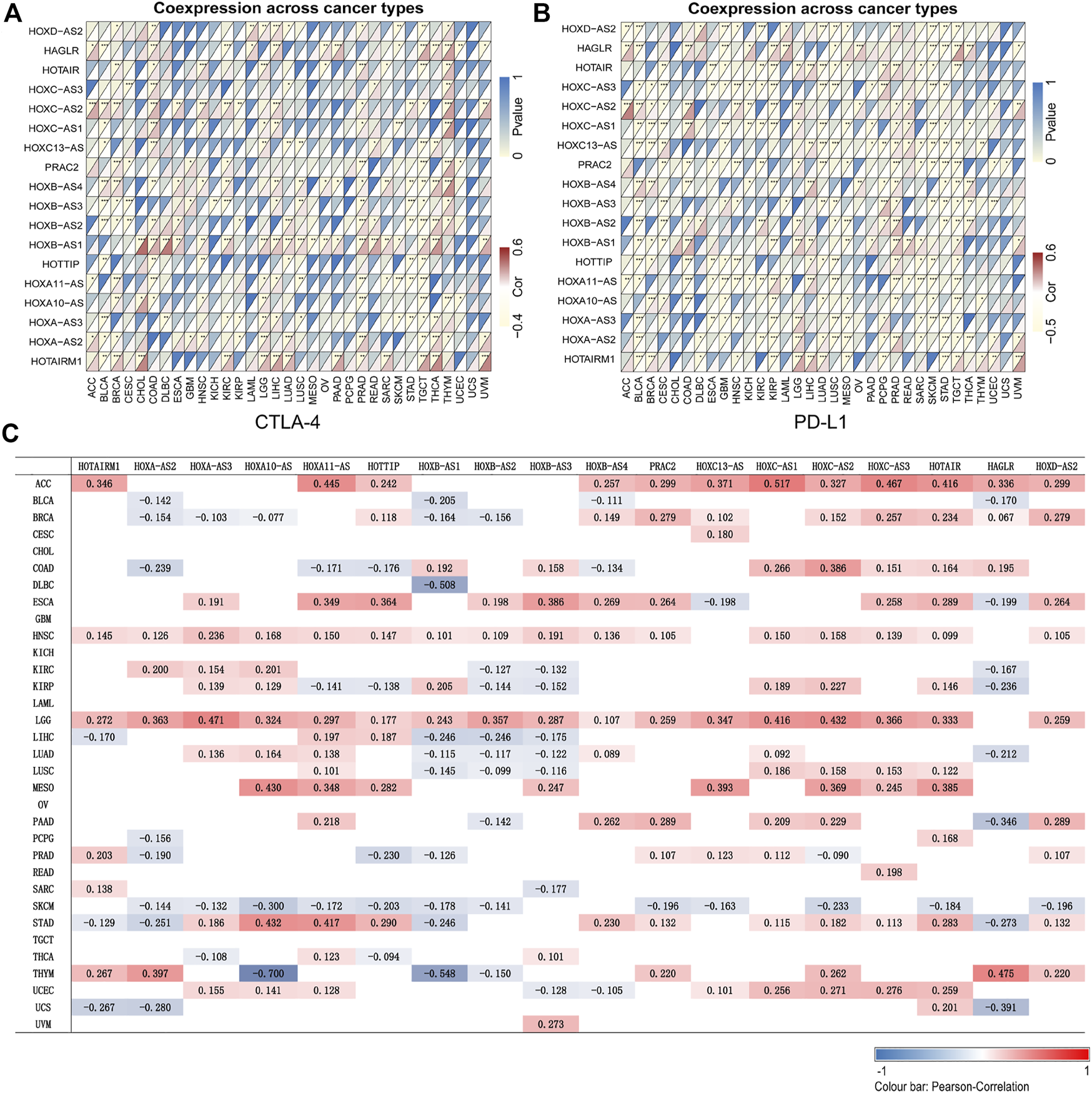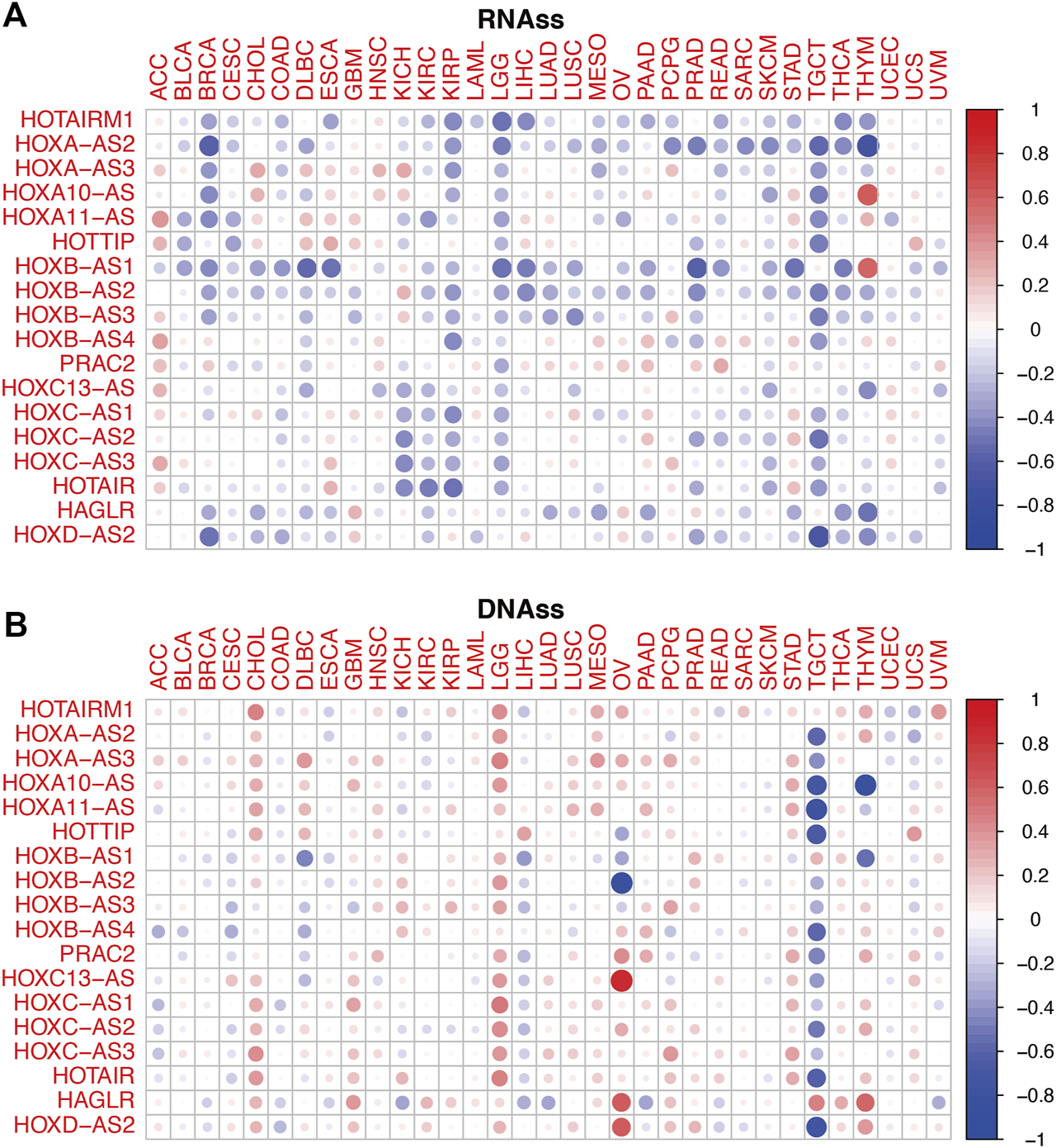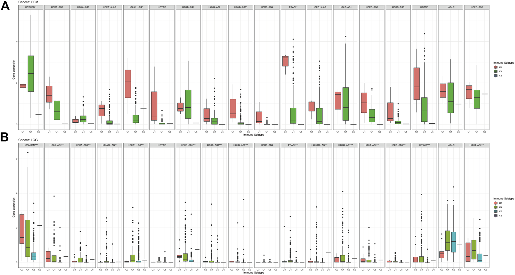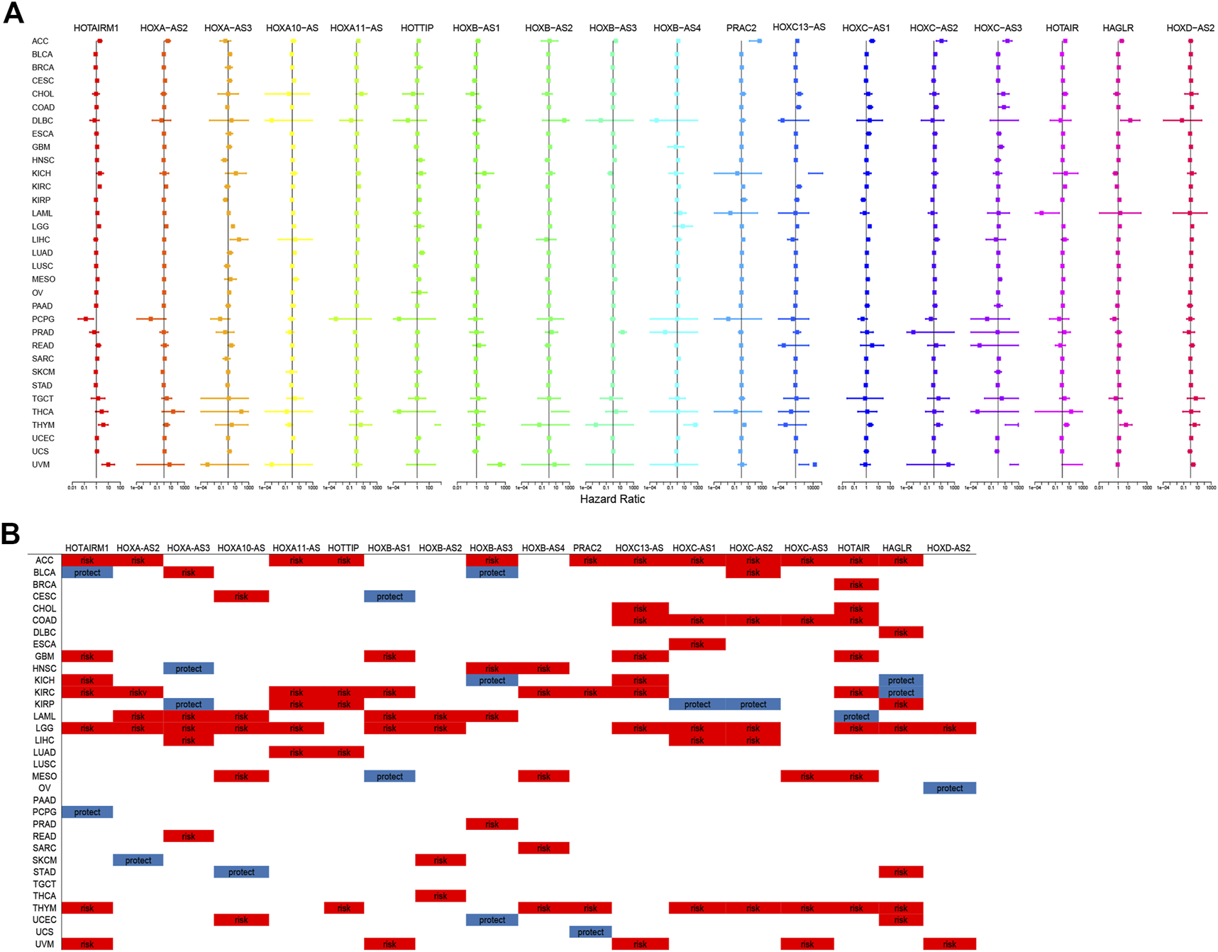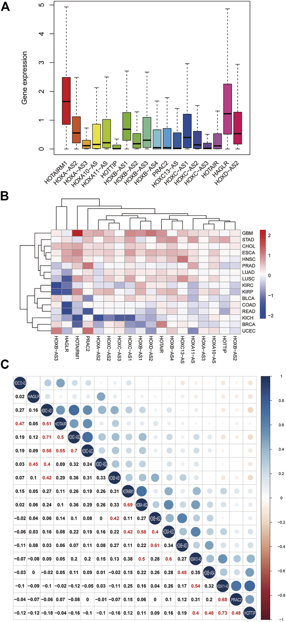 Transcription factors are encoded by homeobox (HOX) genes, which are assigned to a group of 13 orthologs and paralogs in four clusters and share similar positions in the homozygous frames, with 9–11 genes per cluster (Cruz et al., 2017). Multiple reports have shown that the dysregulation of 39 HOX genes is implicated in various aspects of cancer. Similar to protein-coding transcripts, accumulating experimental evidence indicates that lncRNA transcripts in the Hox gene locus, with 18 referenced non-coding antisense transcripts (HOXATs) are implicated in cancer progression. These 18 HOXATs are located in four HOXATs clusters, with the HOXA region consisting of HOTAIRM1, HOXA-AS2, HOXA-AS3, HOXA10-AS, HOXA11-AS, and HOTTIP, the HOXB region consisting of HOXB-AS1, HOXB-AS2, HOXB-AS3, HOXB-AS4, and PRAC2, the HOXC region consisting of HOXC13-AS, HOXC-AS1, HOXC-AS2, HOXC-AS3, and HOTAIR, and the HOXD region consisting of HAGLR and HOXD-AS2. For example, it has been reported that the expression levels of HOXA10-AS, HOXA11-AS, and HOXA-AS are significantly upregulated in lung adenocarcinoma (LUAD), and their high expression levels in such a cancer type are associated with shorter survival periods in patients (Hao and Yu, 2018; Dasti et al., 2020). Further, it has also been observed that the expression levels of HOTAIRM1, HOXA10-AS, HOXA10-AS, HOXA11-AS, HOXA-AS2, HOXA-AS3, HOXB-AS1, HOXC13-AS, HOXC-AS3, and HOXD-AS2 are upregulated in glioma, and are positively correlated with malignancy (Li et al., 2017; Li et al., 2020a), and importantly, some studies have shown that HOXATs can play fundamental roles in immune system regulation (Li et al., 2020b; Liang et al., 2020). However, the different expression levels and the specific functions of the individual HOXATs in pan-cancer as well as their association with the TME still remain unclear. Therefore, an in-depth investigation and analysis of their potential roles in pan-cancer is warranted.