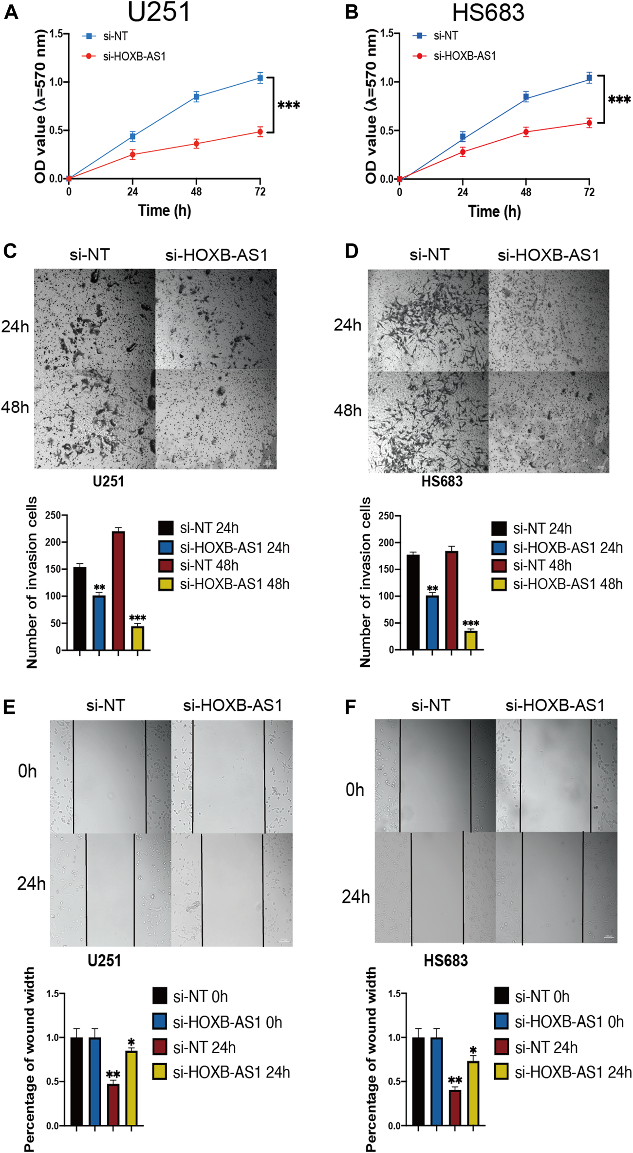 To realize invasion assay, transwell chambers (Corning, Tewksbury, MA, United States) were coated with Matrigel (dilution 1:8; BD Biosciences, Bedford, MA, United States). Thereafter, a 120-μL serum-free medium containing 5 × 104 cells was added to the upper chamber, while a 600-μL complete medium containing 10% FBS was added to the lower chamber. After transfaction, the cells on the lower surface were fixed with methanol and stained with 0.1% crystal violet and then captured using an inverted microscope (AMG, United States). To realize the wound healing assay, U251 and HS683 cells were incoculated into 6-well plates. When the cell cultures reached 80% confluence, the cells were scraped using a 10-μL micropipette tip. Thereafter, images were captured using an inverted microscope with a camera (AMG, United States). The distance travelled by the migrating cells was quantified to assess cell migration capacity using ImageJ software version 1.46 (National Institutes of Health, Bethesda, MD, United States).