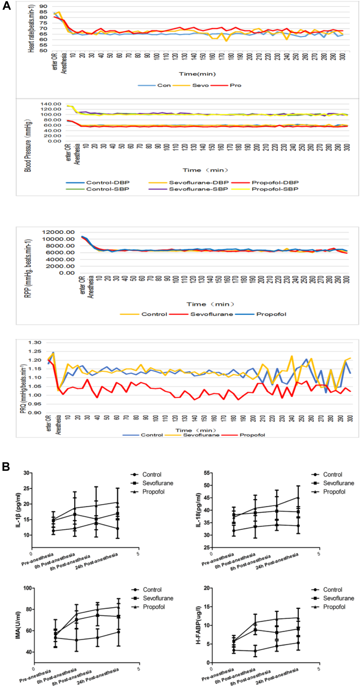 FIGURE 2. Changes in vital signs and inflammatory factors in these three groups of patients (A) different general anesthetics on the changes of heart rate, blood pressure, RPP and PRQ in peri-anesthesia in the three groups (B) Changes of IL-18 at different time points at pre- and post-anesthesia.