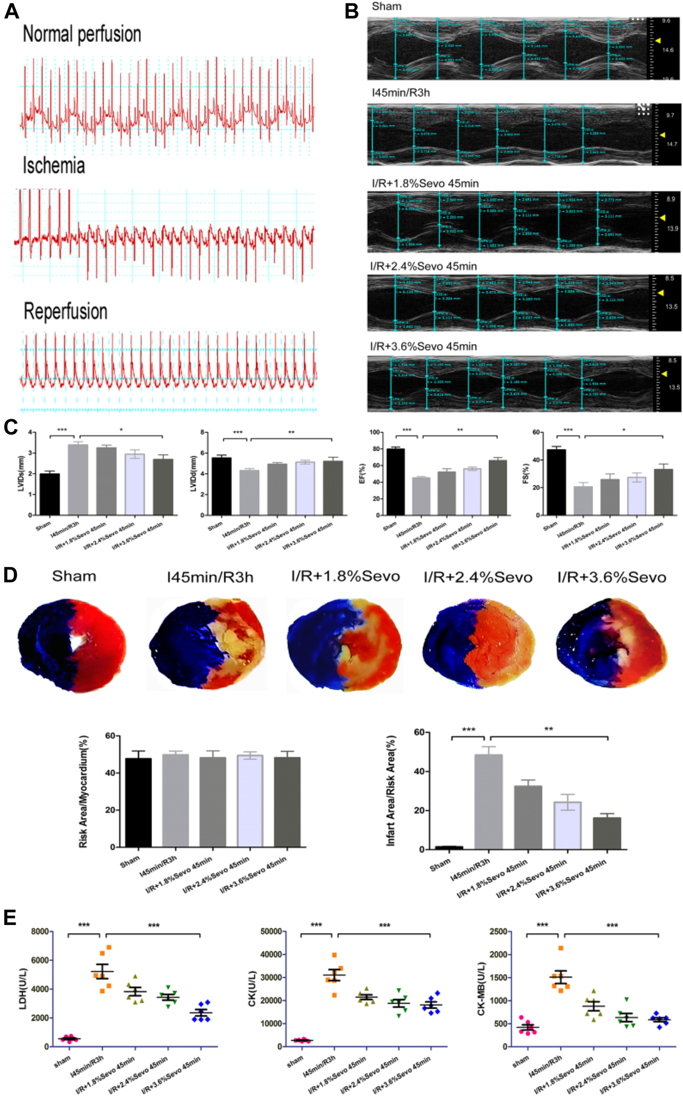 FIGURE 3. Sevoflurane alleviates MIRI in rats (A) Typical electrocardiogram of normal perfusion, ligation of LAD and reperfusion (B) Cardiac ultrasonography in rats of normal perfusion, MIRI and treatment with different concentrations of sevoflurane (C) Histogram of rat cardiac ultrasonography (D) Myocardial infarction area and histogram of rats treated with different concentrations of sevoflurane (E) Effects of Sevoflurane at different concentrations on the release of LDH, CK and CK-MB in myocardial tissue after MIRI. Data are expressed relative to the mean value of sham group and were presented as mean ± SD (n = 6). *p < 0.05, **p < 0.01, ***p < 0.001 vs respective controls.
