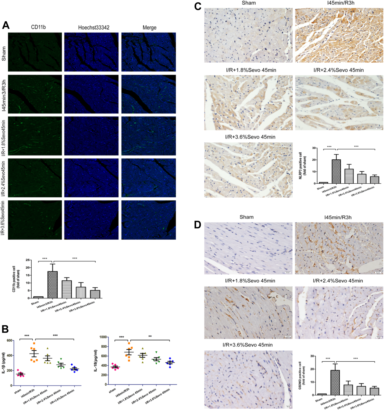 CD11b is the biomarker of monocytes, macrophages, neutrophils and NK cells. Positive immunofluorescent staining of CD11b showed these cells. As shown in Figure 4A, the number of CD11b-labeled inflammatory cells increased in the myocardium of rats in the ischemia-reperfusion group. However, the accumulation of inflammatory cells in Sevoflurane pretreated rats was significantly reduced compared with the rats in I/R group, with less inflammatory cell aggregation and fewer CD11b-labeled inflammatory cells.