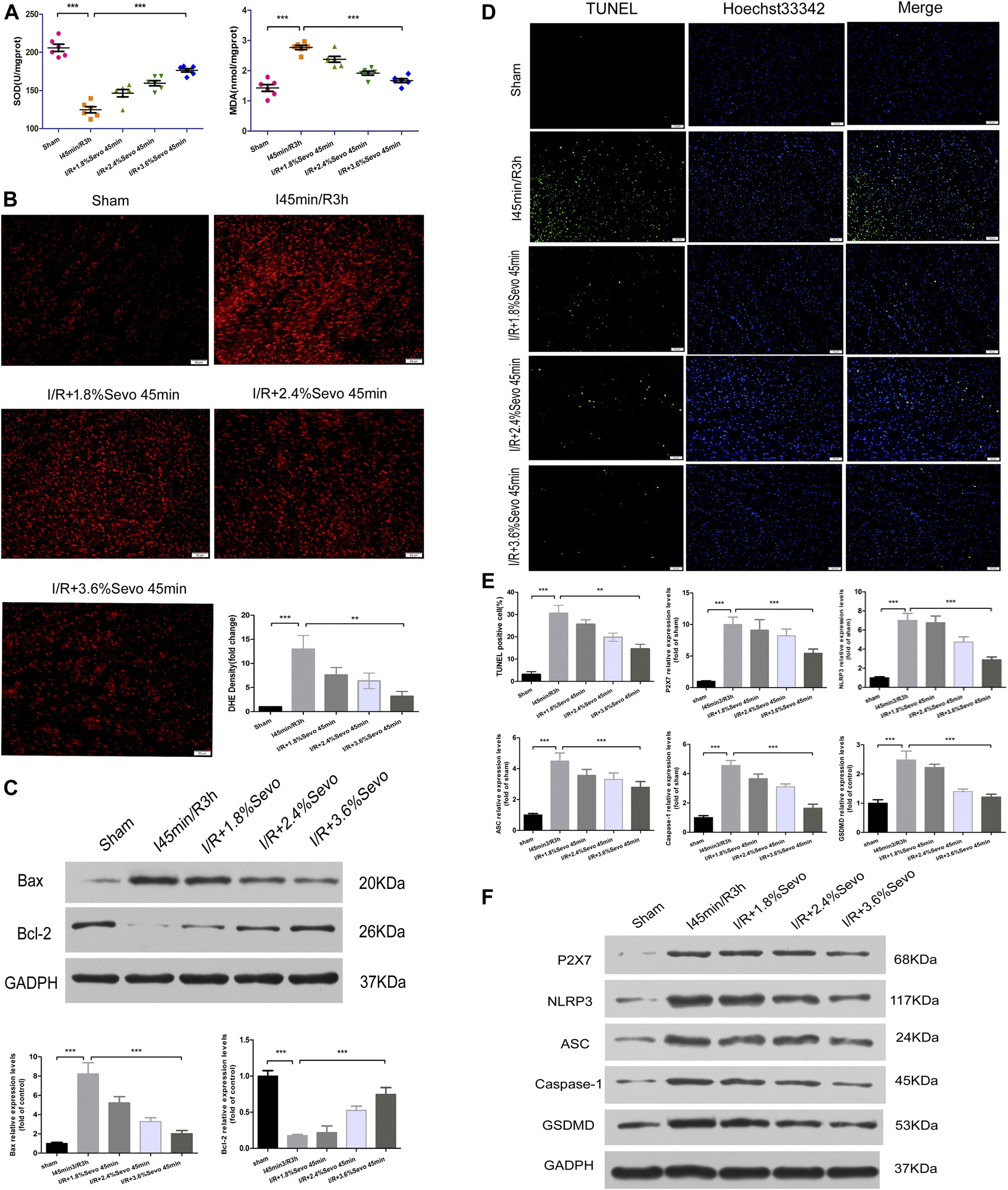 FIGURE 5. Sevoflurane alleviates oxidative stress and pyroptosis in MIRI rats (A) Effects of different concentrations of Sevoflurane on the expression of MDA and SOD in myocardial tissue after ischemia reperfusion. All values are expressed as means ± SD (n = 6). *p < 0.05, **p < 0.01, ***p < 0.001 vs respective controls (B) ROS Fluorescent Probe-DHE. Sevoflurane increased ATP content, stabilized membrane potential, and reduced ROS production (n = 6,Scale bars 50 um) (C) The Expression of apoptosis-related proteins Bax and Bcl-2.Data are expressed relative to the mean value for sham group and were presented as mean ± SD (n = 6). *p < 0.05, **p < 0.01, ***p < 0.001 vs respective controls (D) Effects of different concentrations of Sevoflurane on the TUNEL staining in myocardial tissue after MIRI. All values are expressed as means ± SD (n = 6). *p < 0.05, **p < 0.01, ***p < 0.001 vs respective controls. Scale bars 50 um (E) Histogram of TUNEL and the protein expression of P2X7, NLRP3, ASC, Caspase-1 and GSDMD (F) Immunoblotting measured the levels of P2X7, NLRP3, ASC, Caspase-1 and GSDMD protein expression. Data are expressed relative to the mean value for control group and were presented as mean ± SD (n = 6). *p < 0.05, **p < 0.01, ***p < 0.001 vs respective controls.