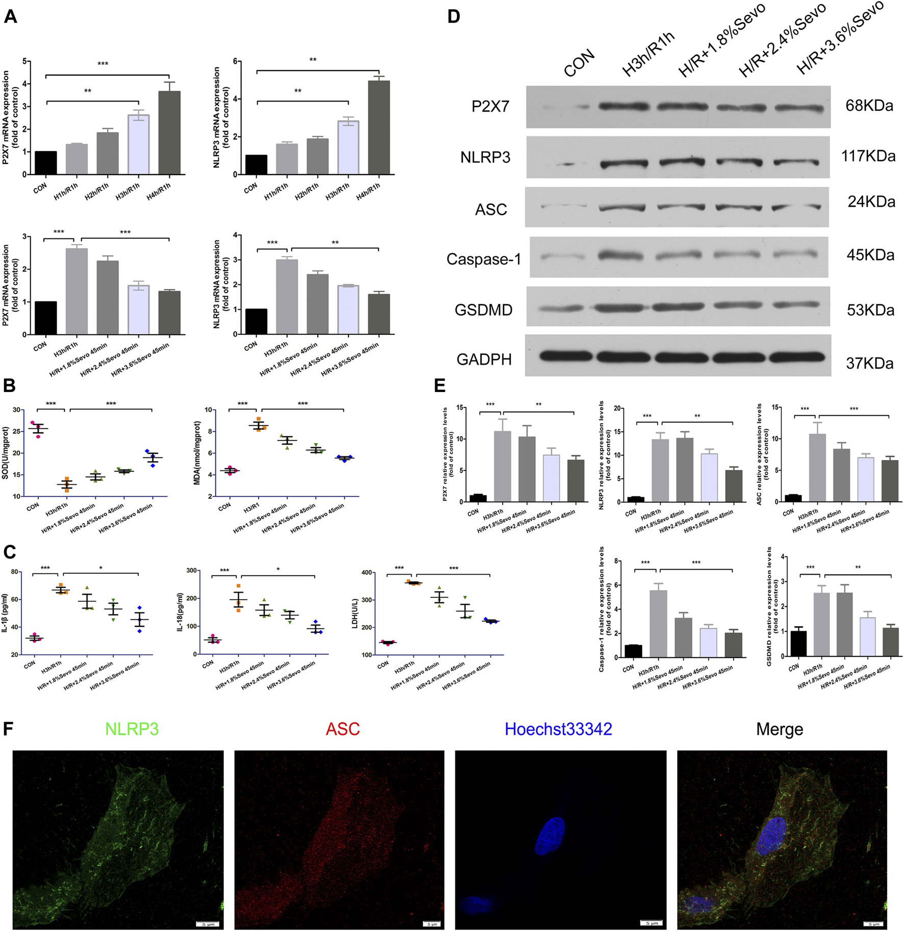 FIGURE 6. Sevoflurane inhibited the activation of inflammasome and pyroptosis induced by hypoxia and reoxygenation of NRVM (A) The expression of P2X7 and NLRP3 mRNA detected by real-time PCR. Data are expressed relative to the mean value for control group and were presented as mean ± SD (n = 3). *p < 0.05, **p < 0.01, ***p < 0.001 vs respective controls (B) Effects of different concentrations of Sevoflurane on the content of MDA and SOD. All values are expressed as mean ± SD (n = 3). *p < 0.05, **p < 0.01, ***p < 0.001 vs respective controls (C) Effects of Sevoflurane at different concentrations on the release of IL-1β, IL-18 and LDH in NRVM after H/R. All values are expressed as mean ± SD (n = 3). *p < 0.05, **p < 0.01, ***p < 0.001 vs respective controls (D) Effects of Sevoflurane at different concentrations on the protein expression of P2X7,NLRP3,ASC,Caspase-1 and GSDMD in NRVM after H/R by immunoblotting analysis (E) Histogram of the protein expression of P2X7,NLRP3,ASC,Caspase-1 and GSDMD. Data are expressed relative to the mean value for control group and were presented as mean ± SD (n = 3). *p < 0.05, **p < 0.01, ***p < 0.001 vs respective controls (F) Colocalization of NLRP3 and ASC in NRVM was observed by the laser scanning confocal microscope(n = 3,Scale bars five um).