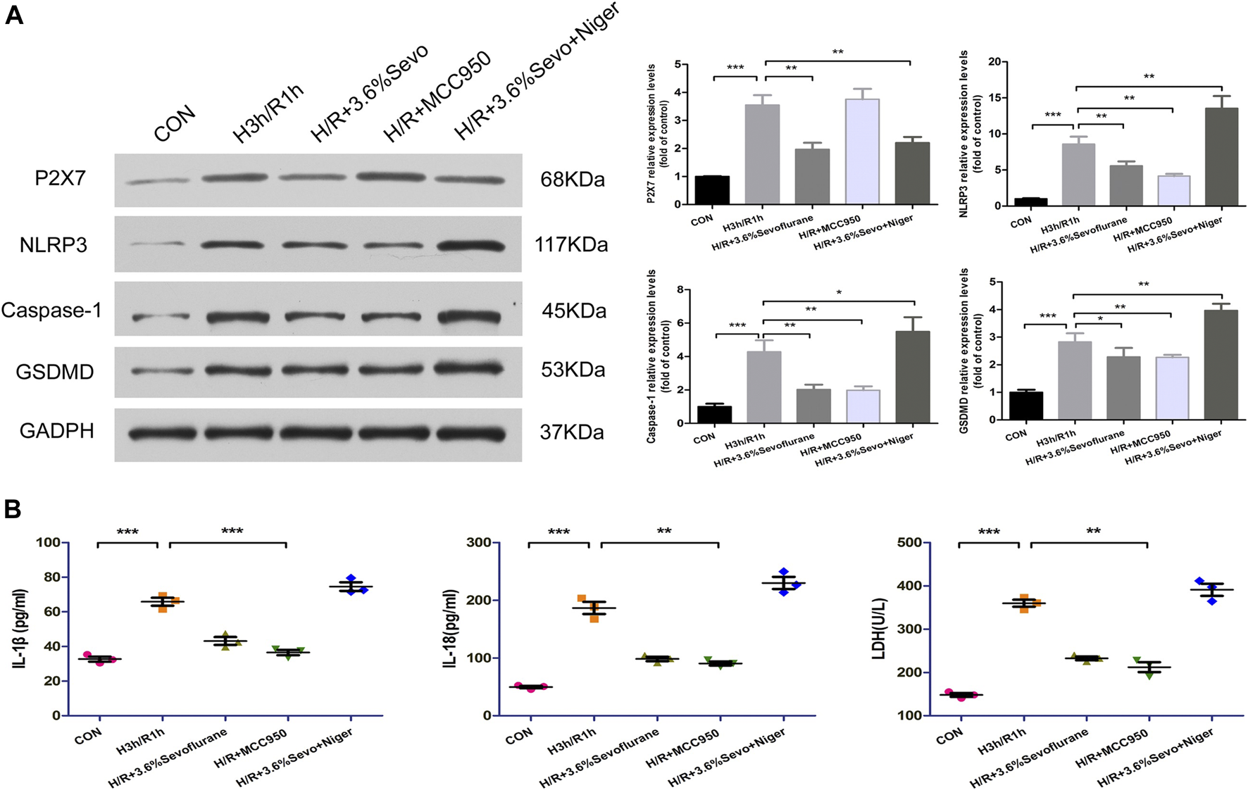 After hypoxia and reoxygenation, the protein expressions of P2X7, NLRP3, Caspase-1 and GSDMD were increased. MCC950, an inhibitor of NLRP3, inhibited the up-regulation of NLRP3, Caspase-1 and GSDMD induced by H/R.As an agonist of NLRP3, Nigericin affected the inhibitory effect of Sevoflurane on the protein expression of P2X7, NLRP3, caspase-1 and GSDMD, and up-regulated the expressions of NLRP3, caspase-1 and GSDMD (Figure 7A).